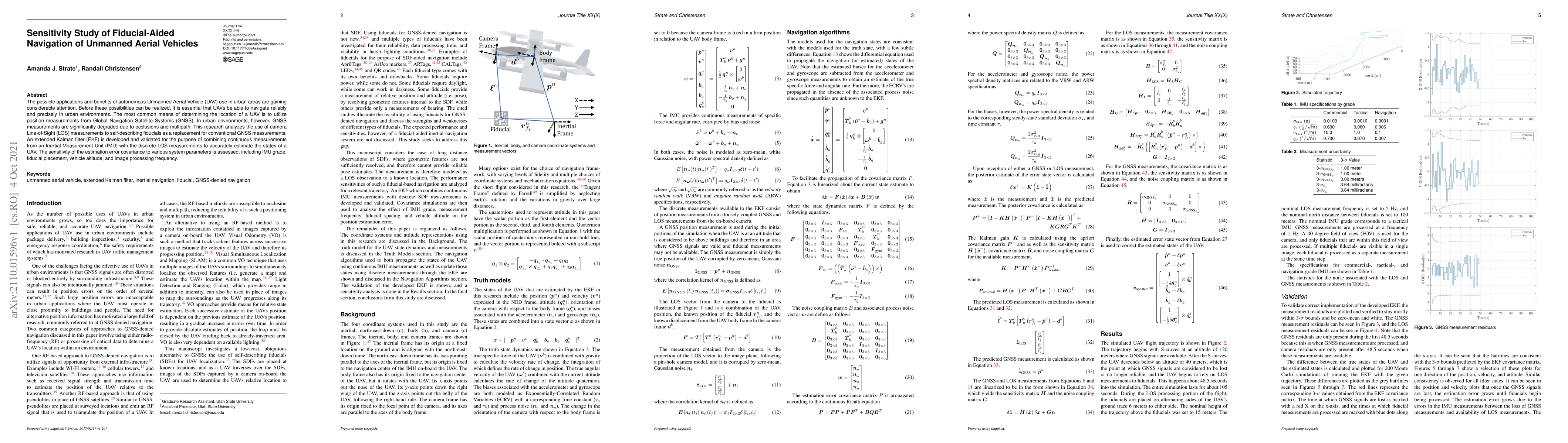 The possible applications and benefits of autonomous Unmanned Aerial Vehicle (UAV) use in urban areas are gaining considerable attention. Before these possibilities can be realized, it is essential that UAVs be able to navigate reliably and precisely in urban environments. The most common means of determining the location of a UAV is to utilize position measurements from Global Navigation Satellite Systems (GNSS). In urban environments, however, GNSS measurements are significantly degraded due to occlusions and multipath. This research analyzes the use of camera Line-of-Sight (LOS) measurements to self-describing fiducials as a replacement for conventional GNSS measurements. An extended Kalman filter (EKF) is developed and validated for the purpose of combining continuous measurements from an Inertial Measurement Unit (IMU) with the discrete LOS measurements to accurately estimate the states of a UAV. The sensitivity of the estimation error covariance to various system parameters is assessed, including IMU grade, fiducial placement, vehicle altitude, and image processing frequency.