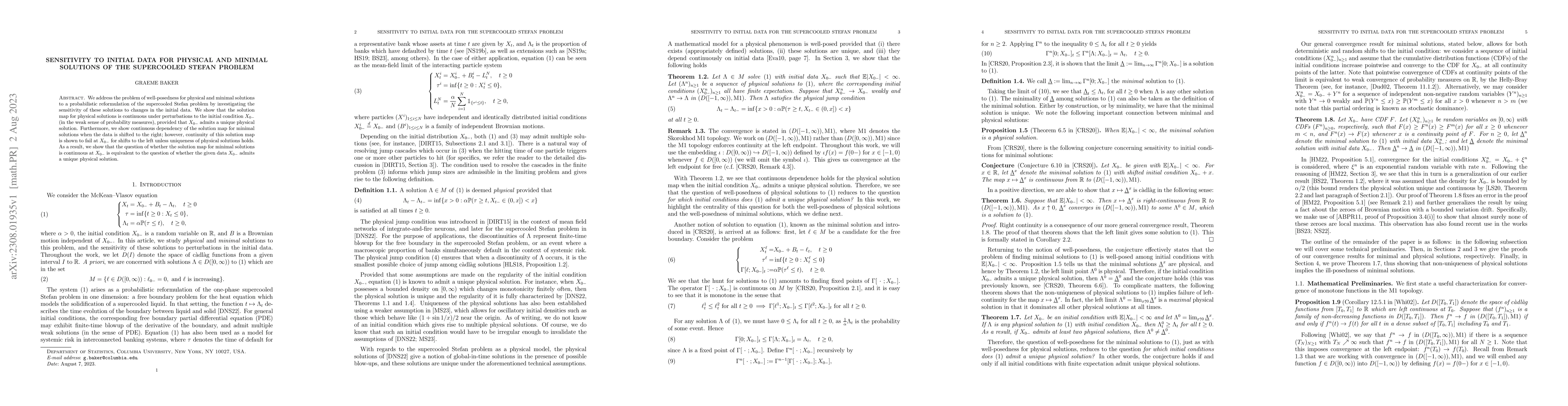 We address the problem of well-posedness for physical and minimal solutions to a probabilistic reformulation of the supercooled Stefan problem by investigating the sensitivity of these solutions to changes in the initial data. We show that the solution map for physical solutions is continuous under perturbations to the initial condition $X_{0-}$ (in the weak sense of probability measures), provided that $X_{0-}$ admits a unique physical solution. Furthermore, we show continuous dependency of the solution map for minimal solutions when the data is shifted to the right; however, continuity of this solution map is shown to fail at $X_{0-}$ for shifts to the left unless uniqueness of physical solutions holds. As a result, we show that the question of whether the solution map for minimal solutions is continuous at $X_{0-}$ is equivalent to the question of whether the given data $X_{0-}$ admits a unique physical solution.