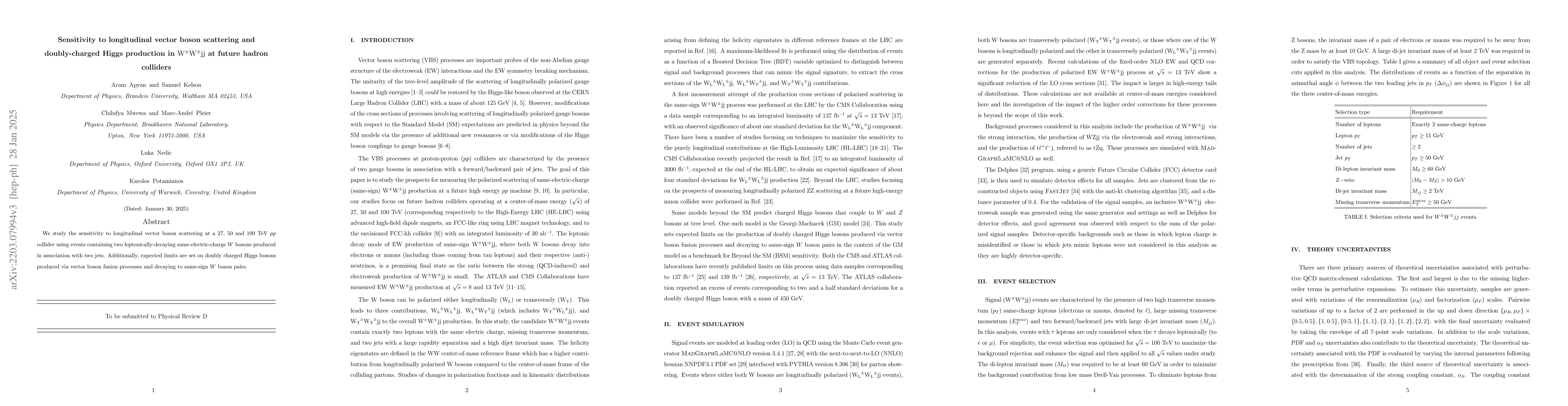 This paper investigates the sensitivity to longitudinal vector boson scattering at future hadron colliders operating at 27, 50, and 100 TeV, focusing on events with two leptonically-decaying same-charge $W$ bosons accompanied by two jets. The study aims to assess the potential for discovering or constraining this scattering process.