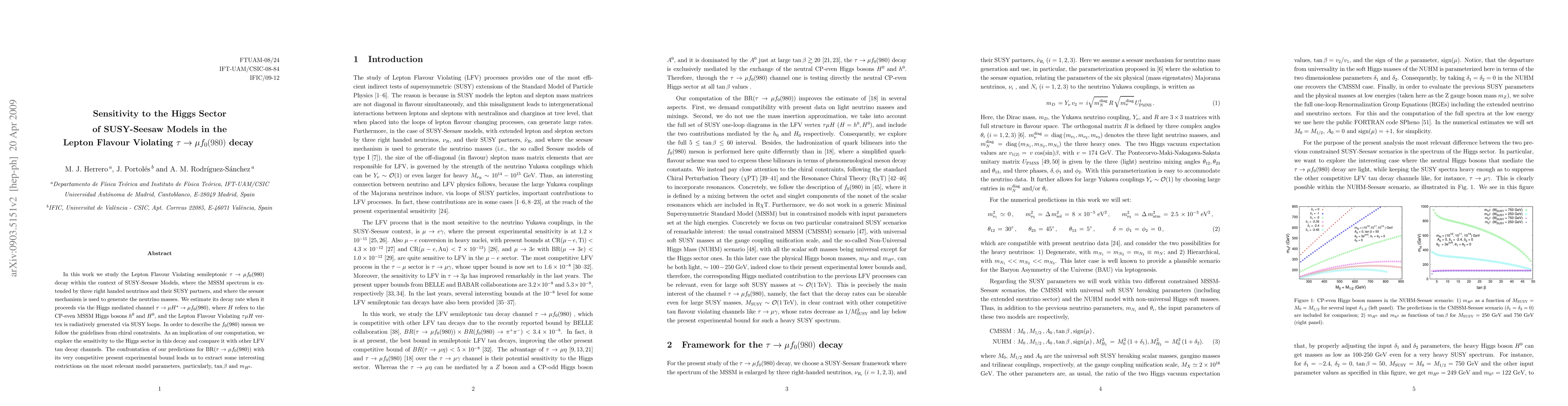 This paper investigates the Lepton Flavour Violating decay tau --> mu f0(980) within SUSY-Seesaw Models, estimating its rate via Higgs-mediated channels. It finds significant sensitivity to the Higgs sector and derives constraints on parameters like tanbeta and m_{H^0} by comparing theoretical predictions with experimental bounds.