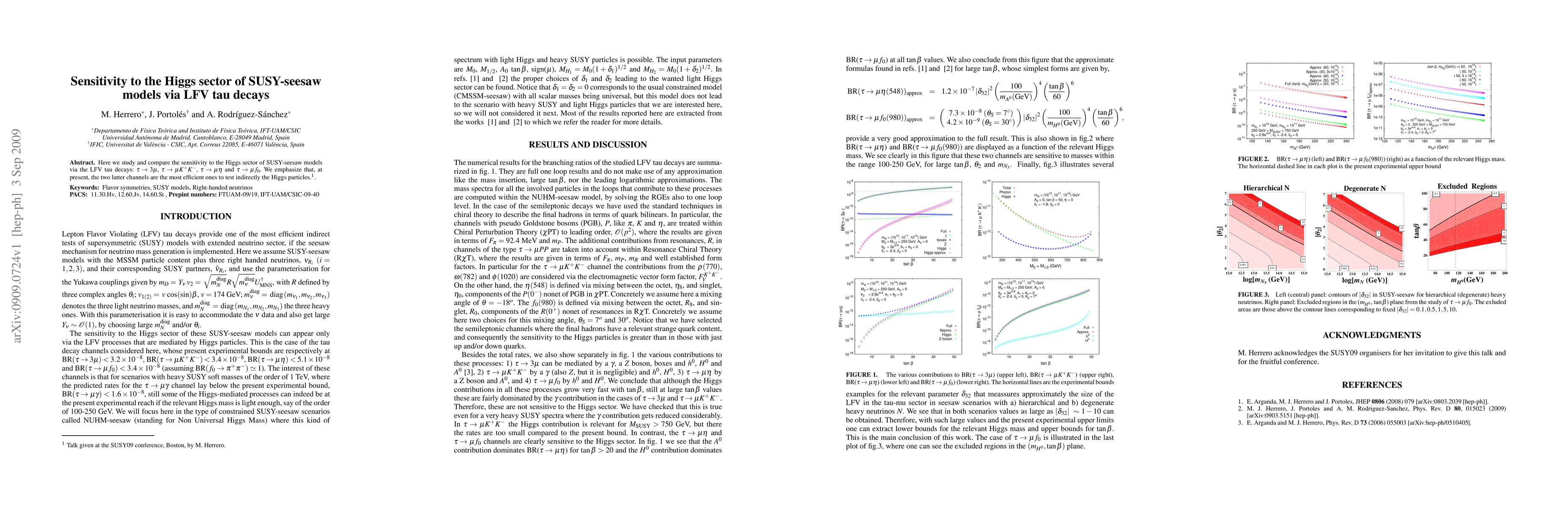 This paper investigates the sensitivity to the Higgs sector in SUSY-seesaw models through the study of lepton flavor violating (LFV) tau decays, focusing on tau-> 3 mu, tau->K^{+}K^{-}, tau->mu eta, and tau->mu f_{0}. It highlights that tau->K^{+}K^{-} and tau->mu f_{0} are currently the most effective channels for indirectly probing Higgs particles.