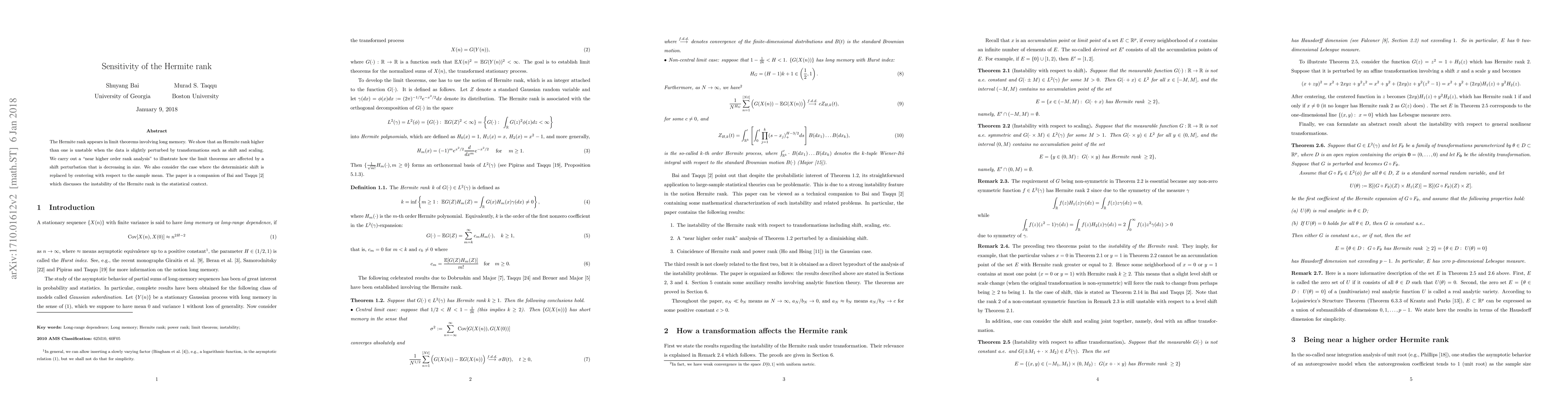The Hermite rank appears in limit theorems involving long memory. We show that an Hermite rank higher than one is unstable when the data is slightly perturbed by transformations such as shift and scaling. We carry out a "near higher order rank analysis" to illustrate how the limit theorems are affected by a shift perturbation that is decreasing in size. As a byproduct of our analysis, we also prove the coincidence of the Hermite rank and the power rank in the Gaussian context. The paper is a technical companion of \citet{bai:taqqu:2017:instability} which discusses the instability of the Hermite rank in the statistical context. (Older title "Some properties of the Hermite rank">)