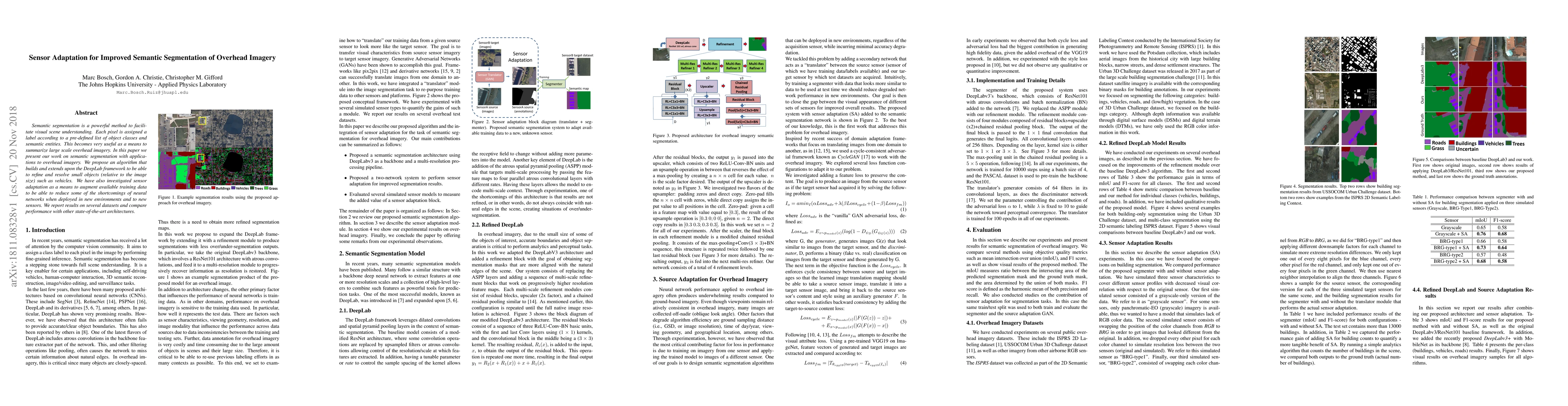 This paper proposes an algorithm for improving semantic segmentation in overhead imagery, including sensor adaptation to enhance performance in new environments and sensors. The results demonstrate improved accuracy compared to other state-of-the-art architectures.