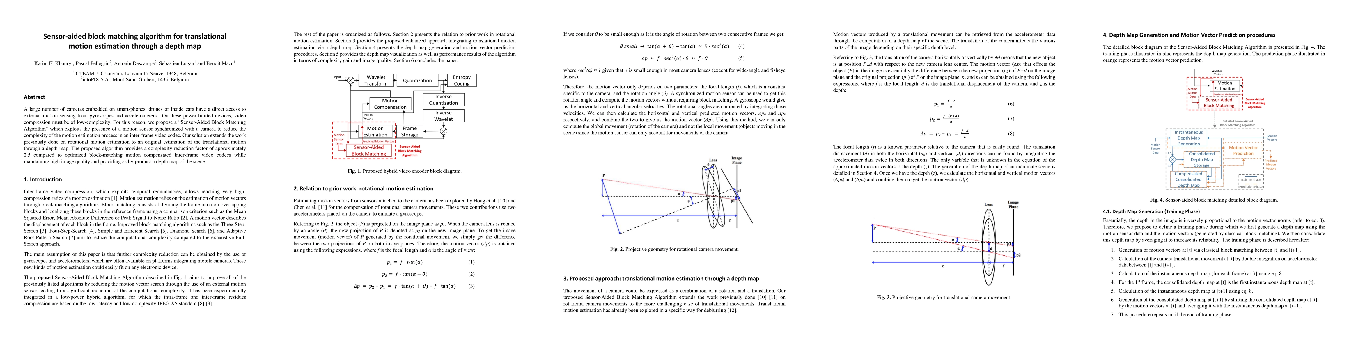 The paper proposes a "Sensor-Aided Block Matching Algorithm" that leverages synchronized motion sensors to reduce the complexity of translational motion estimation in inter-frame video codecs, achieving a complexity reduction of approximately 2.5x while maintaining high image quality and generating a depth map.