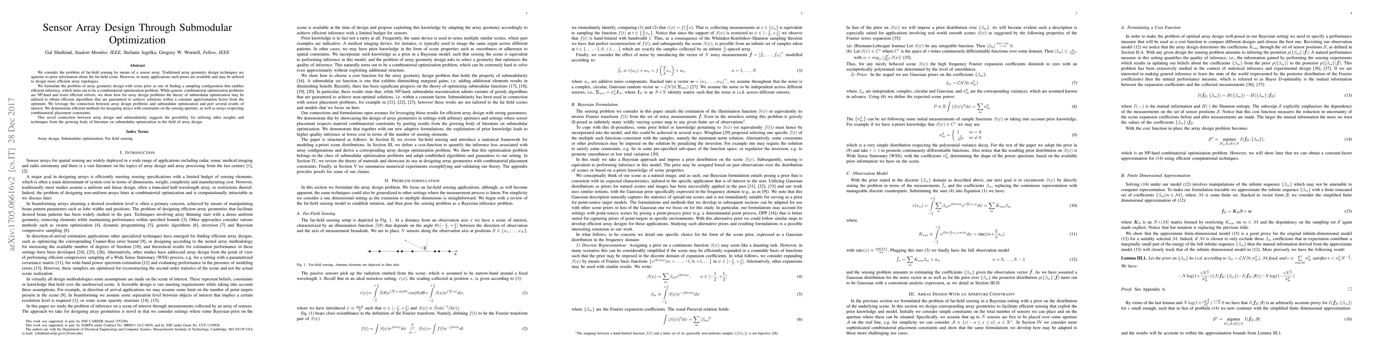 We consider the problem of far-field sensing by means of a sensor array. Traditional array geometry design techniques are agnostic to prior information about the far-field scene. However, in many applications such priors are available and may be utilized to design more efficient array topologies. We formulate the problem of array geometry design with scene prior as one of finding a sampling configuration that enables efficient inference, which turns out to be a combinatorial optimization problem. While generic combinatorial optimization problems are NP-hard and resist efficient solvers, we show how for array design problems the theory of submodular optimization may be utilized to obtain efficient algorithms that are guaranteed to achieve solutions within a constant approximation factor from the optimum. We leverage the connection between array design problems and submodular optimization and port several results of interest. We demonstrate efficient methods for designing arrays with constraints on the sensing aperture, as well as arrays respecting combinatorial placement constraints. This novel connection between array design and submodularity suggests the possibility for utilizing other insights and techniques from the growing body of literature on submodular optimization in the field of array design.
