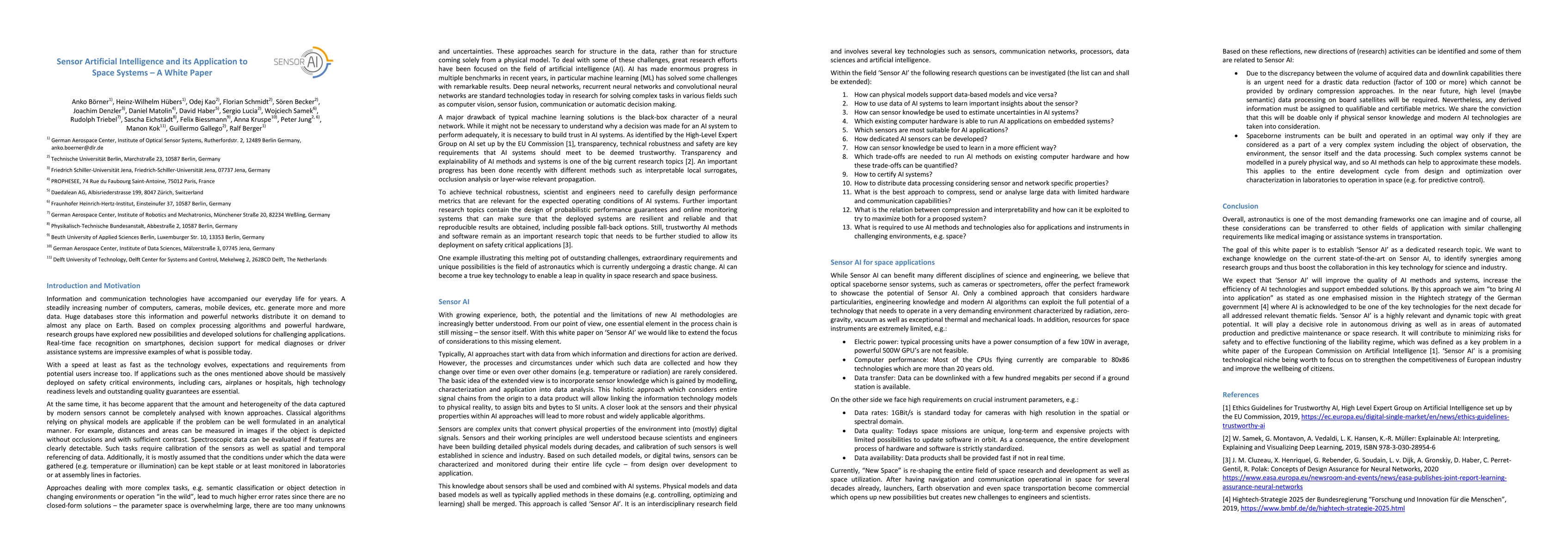 Information and communication technologies have accompanied our everyday life for years. A steadily increasing number of computers, cameras, mobile devices, etc. generate more and more data, but at the same time we realize that the data can only partially be analyzed with classical approaches. The research and development of methods based on artificial intelligence (AI) made enormous progress in the area of interpretability of data in recent years. With growing experience, both, the potential and limitations of these new technologies are increasingly better understood. Typically, AI approaches start with the data from which information and directions for action are derived. However, the circumstances under which such data are collected and how they change over time are rarely considered. A closer look at the sensors and their physical properties within AI approaches will lead to more robust and widely applicable algorithms. This holistic approach which considers entire signal chains from the origin to a data product, "Sensor AI", is a highly relevant topic with great potential. It will play a decisive role in autonomous driving as well as in areas of automated production, predictive maintenance or space research. The goal of this white paper is to establish "Sensor AI" as a dedicated research topic. We want to exchange knowledge on the current state-of-the-art on Sensor AI, to identify synergies among research groups and thus boost the collaboration in this key technology for science and industry.