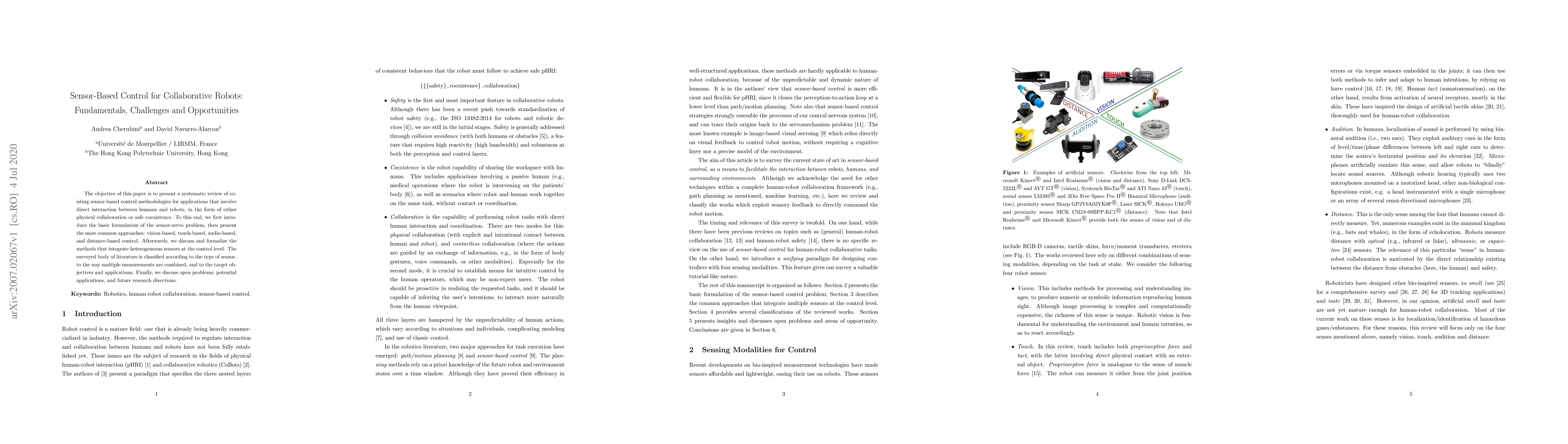 The objective of this paper is to present a systematic review of existing sensor-based control methodologies for applications that involve direct interaction between humans and robots, in the form of either physical collaboration or safe coexistence. To this end, we first introduce the basic formulation of the sensor-servo problem, then present the most common approaches: vision-based, touch-based, audio-based, and distance-based control. Afterwards, we discuss and formalize the methods that integrate heterogeneous sensors at the control level. The surveyed body of literature is classified according to the type of sensor, to the way multiple measurements are combined, and to the target objectives and applications. Finally, we discuss open problems, potential applications, and future research directions.