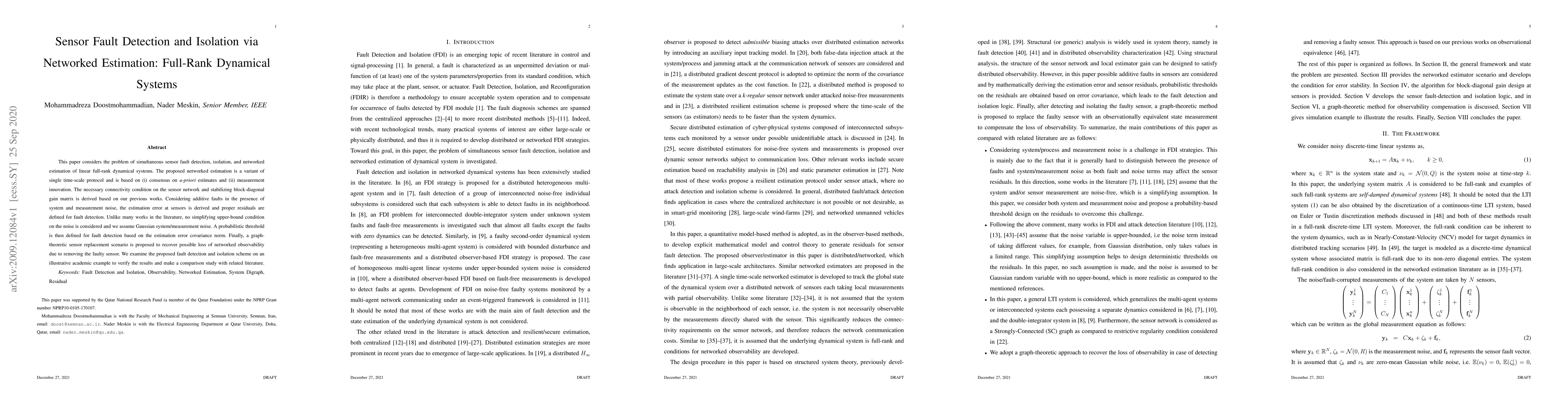 This paper proposes a networked estimation method for detecting and isolating sensor faults in full-rank dynamical systems, using consensus and measurement innovation. It defines probabilistic thresholds for fault detection and suggests a sensor replacement strategy to maintain observability.