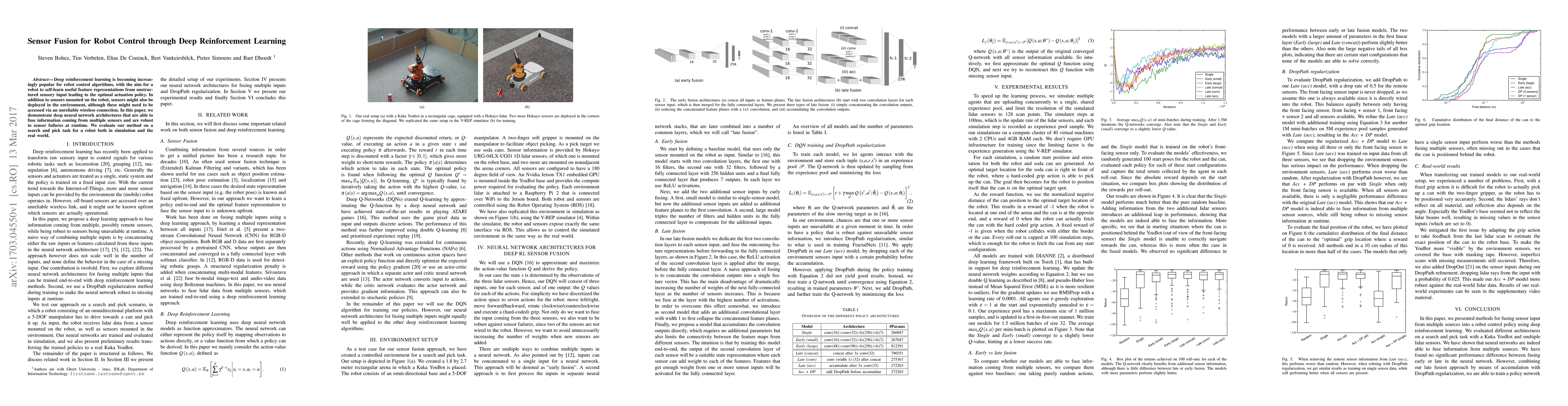 This paper explores deep reinforcement learning techniques for robot control, focusing on sensor fusion from multiple sources, including unreliable wireless connections. The proposed neural network architectures demonstrate robustness to sensor failures and are evaluated on a search and pick task in both simulated and real-world environments.