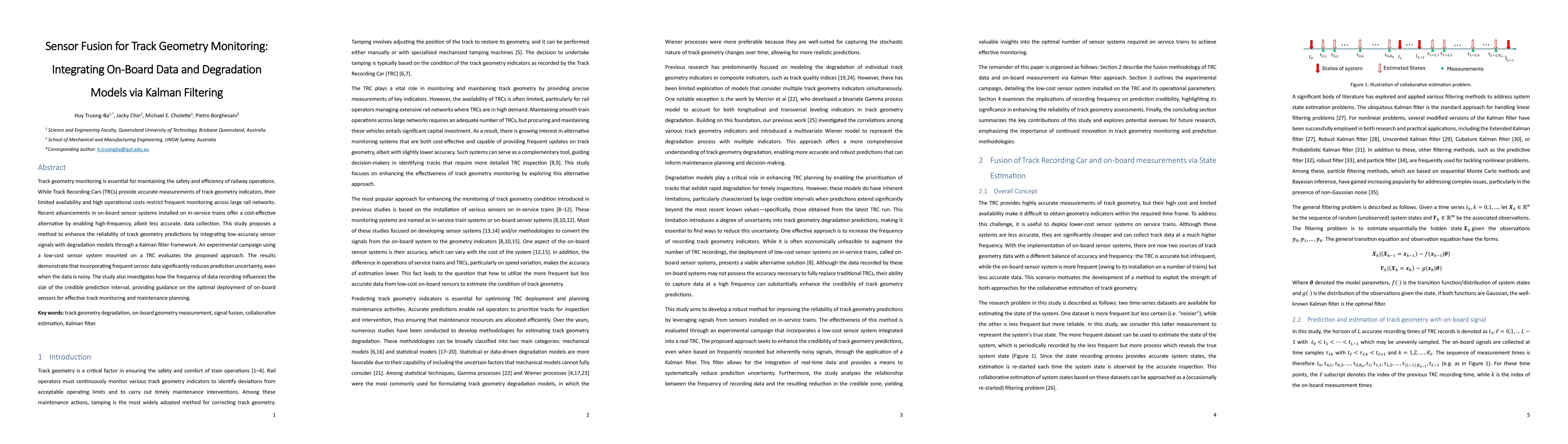 A new method for track geometry monitoring using on-board sensors is proposed, integrating low-accuracy sensor signals with degradation models via Kalman filtering to reduce prediction uncertainty.