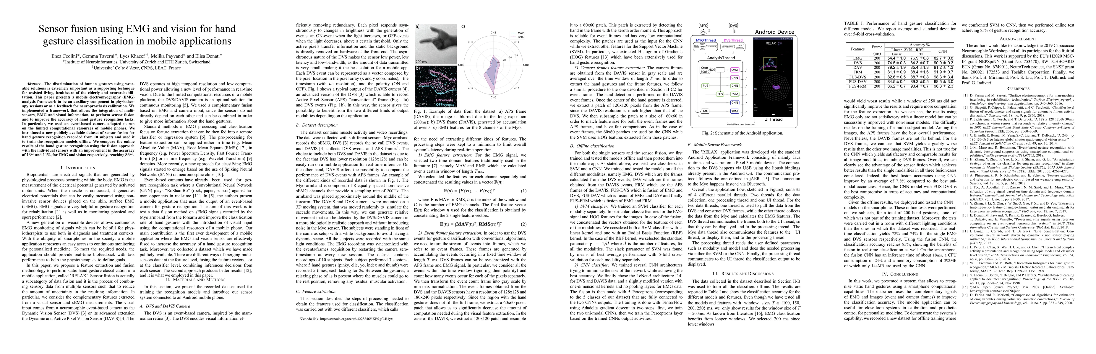 This paper presents a sensor fusion framework combining EMG and vision for enhanced hand gesture classification in mobile applications, achieving a 13% accuracy improvement over EMG alone and a 11% improvement over vision alone, resulting in an overall accuracy of 85%.