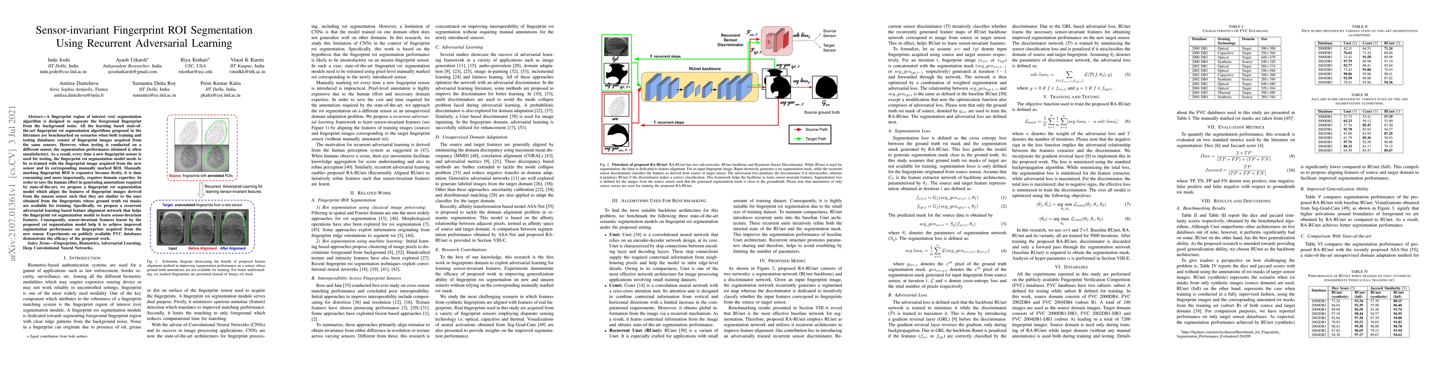 This paper proposes a recurrent adversarial learning-based model for sensor-invariant fingerprint ROI segmentation, aiming to improve performance across different sensors without requiring manual annotations. The method aligns features from unseen sensors to those used in training, achieving better segmentation performance on new sensors.