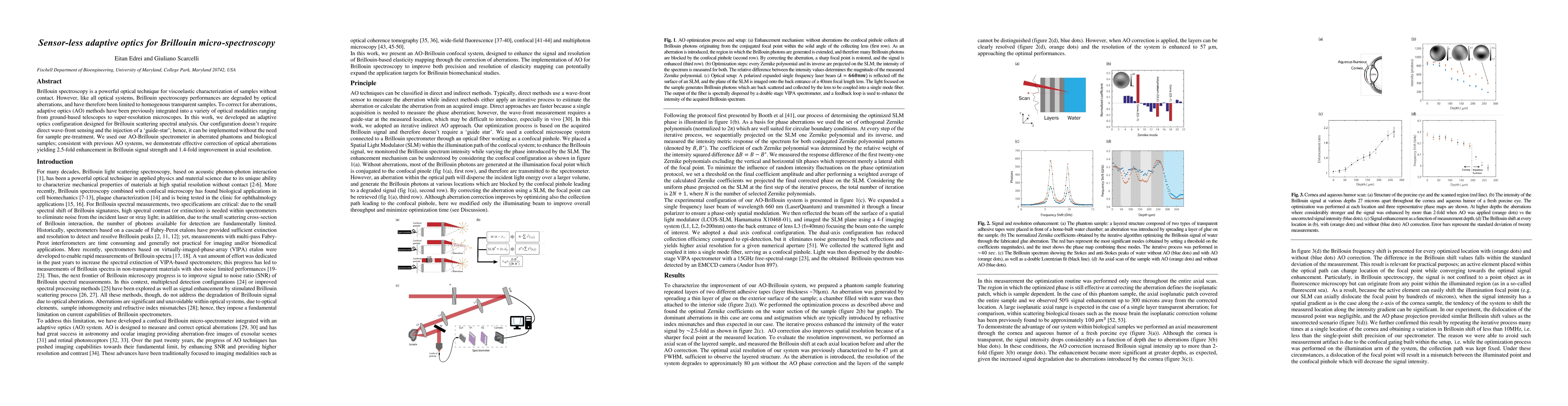 Brillouin spectroscopy is a powerful optical technique for viscoelastic characterization of samples without contact. However, like all optical systems, Brillouin spectroscopy performances are degraded by optical aberrations, and have therefore been limited to homogenous transparent samples. To correct for aberrations, adaptive optics (AO) methods have been previously integrated into a variety of optical modalities ranging from ground-based telescopes to super-resolution microscopes. In this work, we developed an adaptive optics configuration designed for Brillouin scattering spectral analysis. Our configuration doesn't require direct wave-front sensing and the injection of a 'guide-star'; hence, it can be implemented without the need for sample pre-treatment. We used our AO-Brillouin spectrometer in aberrated phantoms and biological samples; consistent with previous AO systems, we demonstrate effective correction of optical aberrations yielding 2.5-fold enhancement in Brillouin signal strength and 1.4-fold improvement in axial resolution.