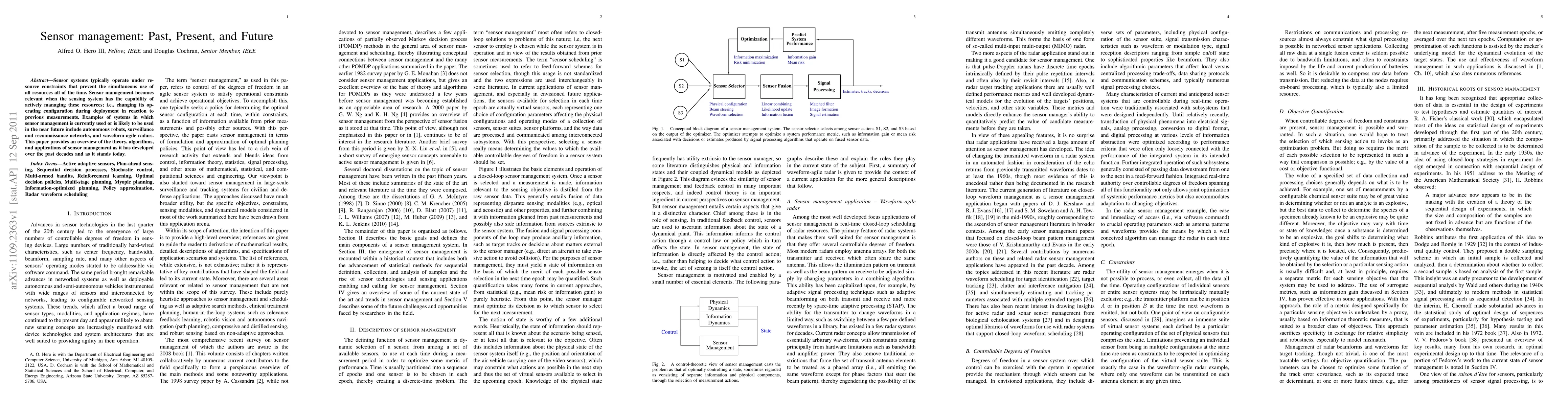 This paper reviews the evolution of sensor management theory, algorithms, and applications, highlighting its importance in resource-constrained environments and its current and future uses in autonomous robots, surveillance networks, and radar systems. It provides a comprehensive overview of the field from past developments to present-day implementations.