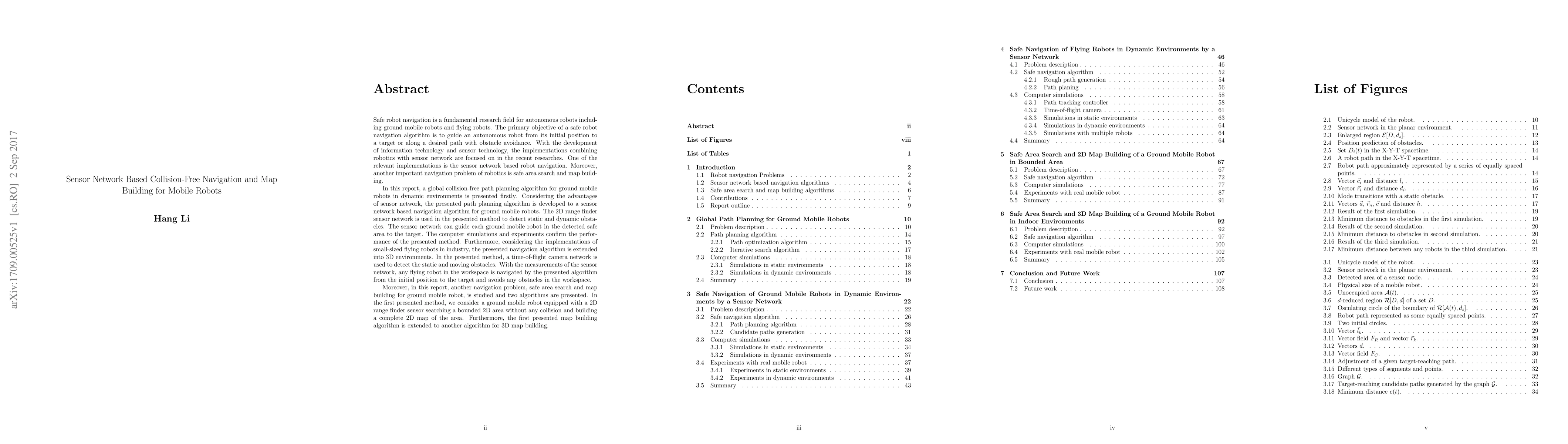 Safe robot navigation is a fundamental research field for autonomous robots including ground mobile robots and flying robots. The primary objective of a safe robot navigation algorithm is to guide an autonomous robot from its initial position to a target or along a desired path with obstacle avoidance. With the development of information technology and sensor technology, the implementations combining robotics with sensor network are focused on in the recent researches. One of the relevant implementations is the sensor network based robot navigation. Moreover, another important navigation problem of robotics is safe area search and map building. In this report, a global collision-free path planning algorithm for ground mobile robots in dynamic environments is presented firstly. Considering the advantages of sensor network, the presented path planning algorithm is developed to a sensor network based navigation algorithm for ground mobile robots. The 2D range finder sensor network is used in the presented method to detect static and dynamic obstacles. The sensor network can guide each ground mobile robot in the detected safe area to the target. Furthermore, the presented navigation algorithm is extended into 3D environments. With the measurements of the sensor network, any flying robot in the workspace is navigated by the presented algorithm from the initial position to the target. Moreover, in this report, another navigation problem, safe area search and map building for ground mobile robot, is studied and two algorithms are presented. In the first presented method, we consider a ground mobile robot equipped with a 2D range finder sensor searching a bounded 2D area without any collision and building a complete 2D map of the area. Furthermore, the first presented map building algorithm is extended to another algorithm for 3D map building.