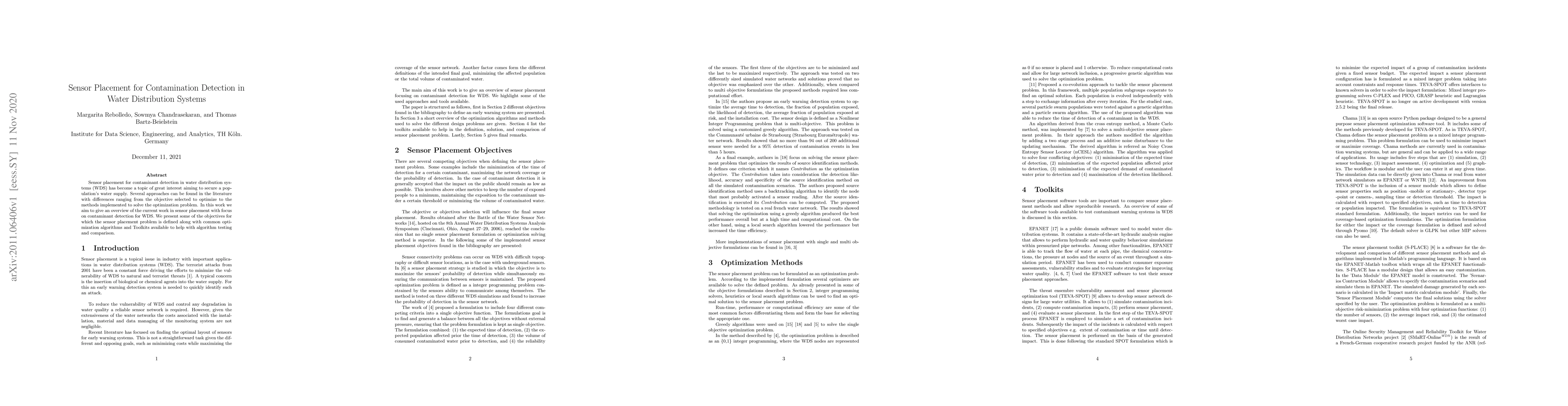 Sensor placement for contaminant detection in water distribution systems (WDS) has become a topic of great interest aiming to secure a population's water supply. Several approaches can be found in the literature with differences ranging from the objective selected to optimize to the methods implemented to solve the optimization problem. In this work we aim to give an overview of the current work in sensor placement with focus on contaminant detection for WDS. We present some of the objectives for which the sensor placement problem is defined along with common optimization algorithms and Toolkits available to help with algorithm testing and comparison.
