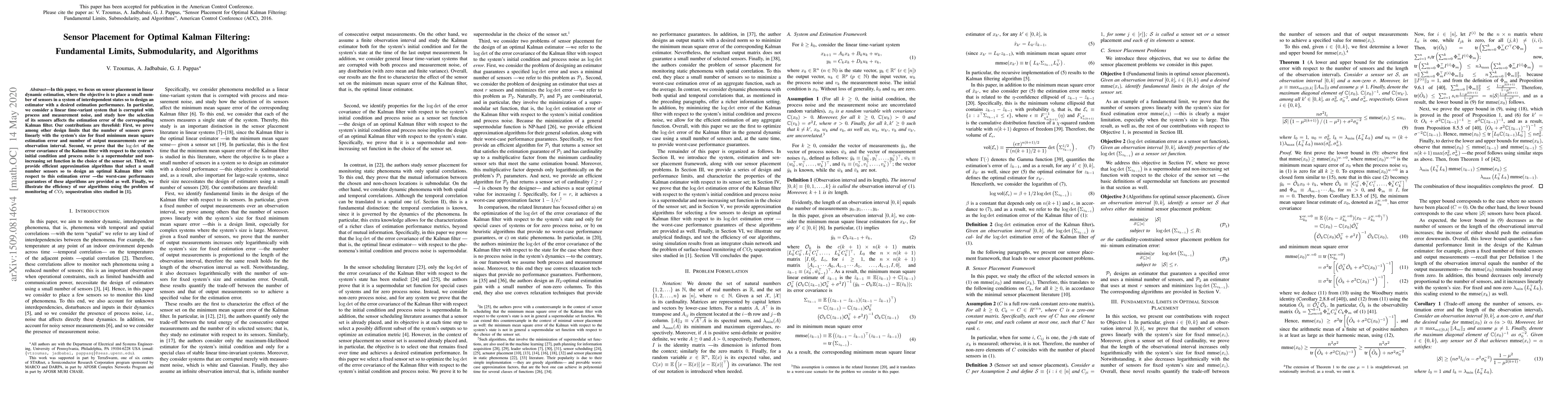 This paper investigates optimal sensor placement for Kalman filtering in linear dynamic systems, revealing fundamental limits on the reduction of estimation error with additional sensors. The authors prove that beyond a certain point, further sensor additions yield diminishing returns, and provide efficient algorithms to optimize sensor selection while ensuring performance guarantees.