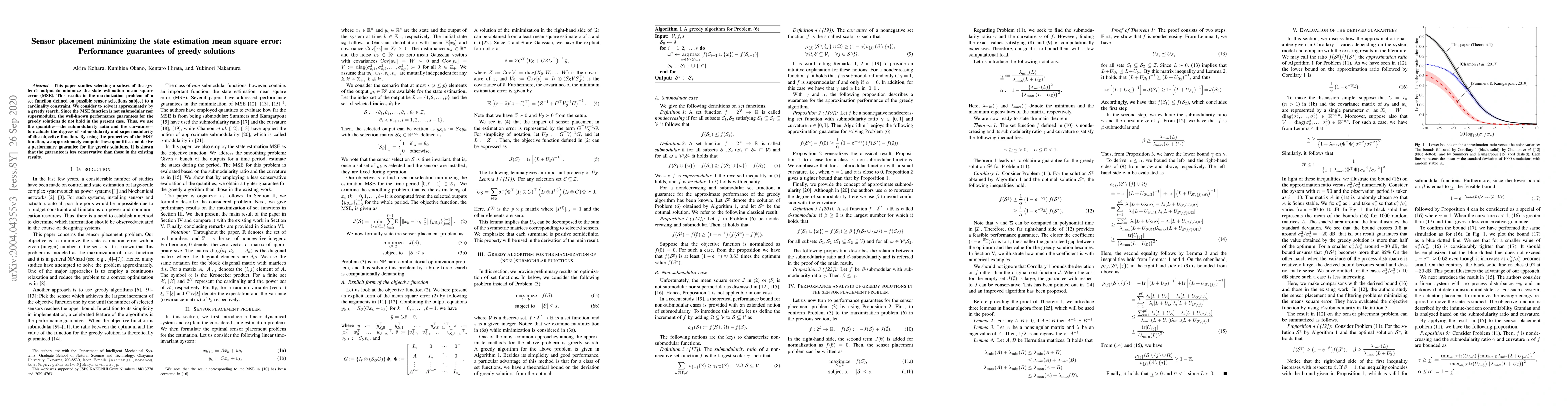 This paper investigates sensor placement strategies to minimize state estimation mean square error (MSE) through a greedy search approach. The authors derive performance guarantees for the greedy method by evaluating the submodularity ratio and curvature of the objective function, showing a less conservative guarantee compared to existing results.
