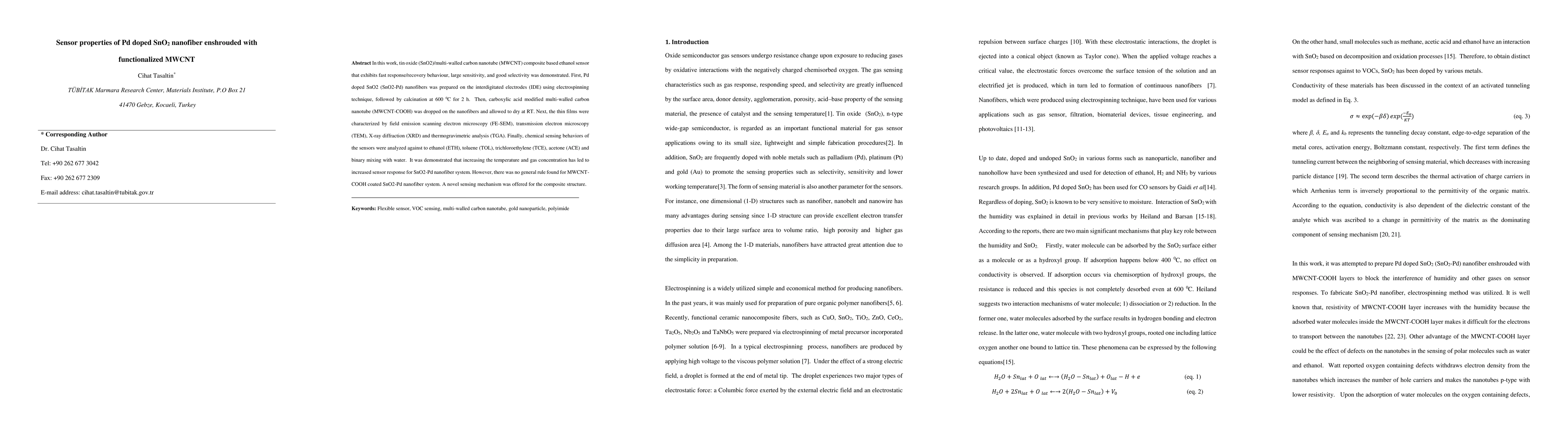 This research developed a SnO2-Pd nanofiber sensor doped with functionalized MWCNT for ethanol detection, showing fast response/recovery, high sensitivity, and good selectivity. The sensor's performance improved with temperature and concentration but exhibited complex behavior when coated with MWCNT-COOH, prompting a novel sensing mechanism explanation.