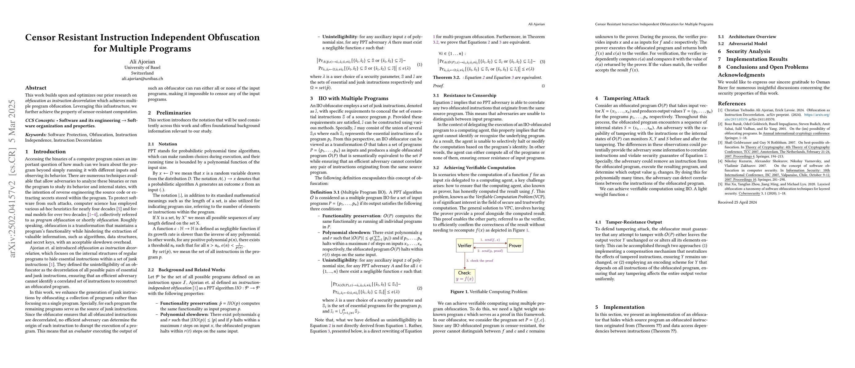 The paper introduces a novel approach to instruction-independent obfuscation for multiple programs, ensuring sensor-resistant computation and censorship resistance.