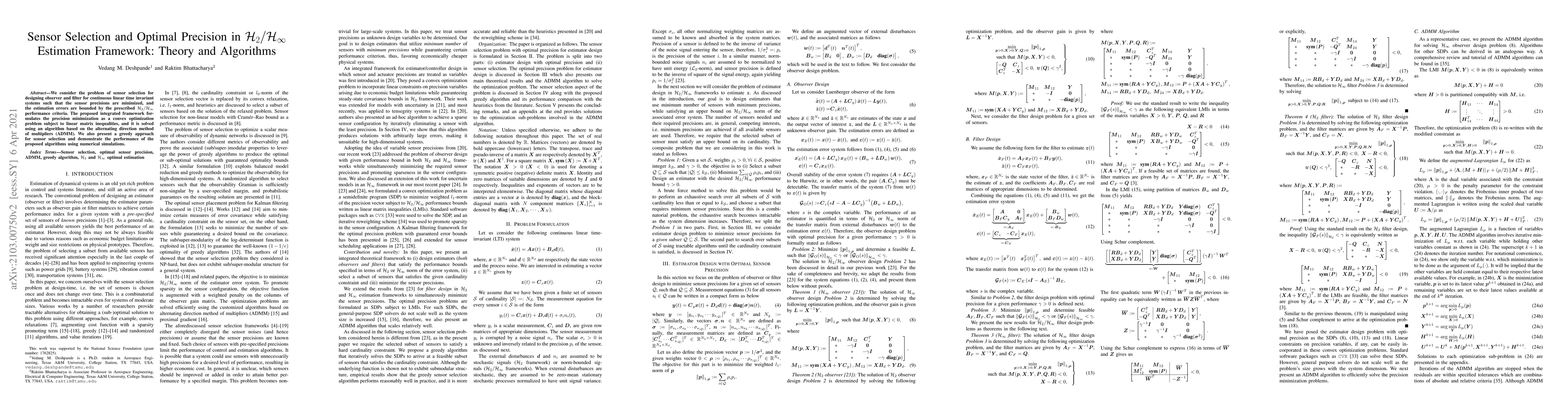 We consider the problem of sensor selection for designing observer and filter for continuous linear time invariant systems such that the sensor precisions are minimized, and the estimation errors are bounded by the prescribed $\mathcal{H}_2/\mathcal{H}_{\infty}$ performance criteria. The proposed integrated framework formulates the precision minimization as a convex optimization problem subject to linear matrix inequalities, and it is solved using an algorithm based on the alternating direction method of multipliers (ADMM). We also present a greedy approach for sensor selection and demonstrate the performance of the proposed algorithms using numerical simulations.