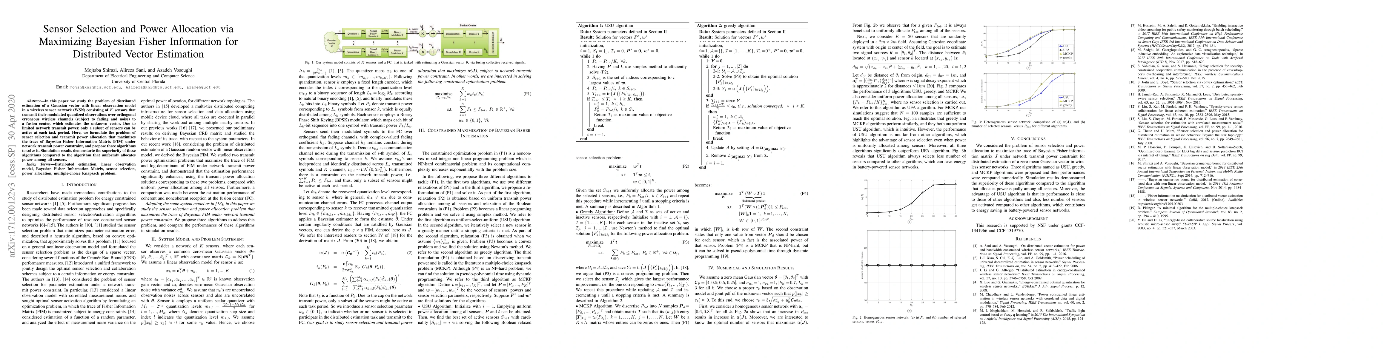 This paper addresses the problem of sensor selection and power allocation in a wireless sensor network to maximize the trace of the Bayesian Fisher Information Matrix for distributed estimation of a Gaussian vector. Three algorithms are proposed to optimize this objective under transmit power constraints, outperforming uniform power allocation in simulations.