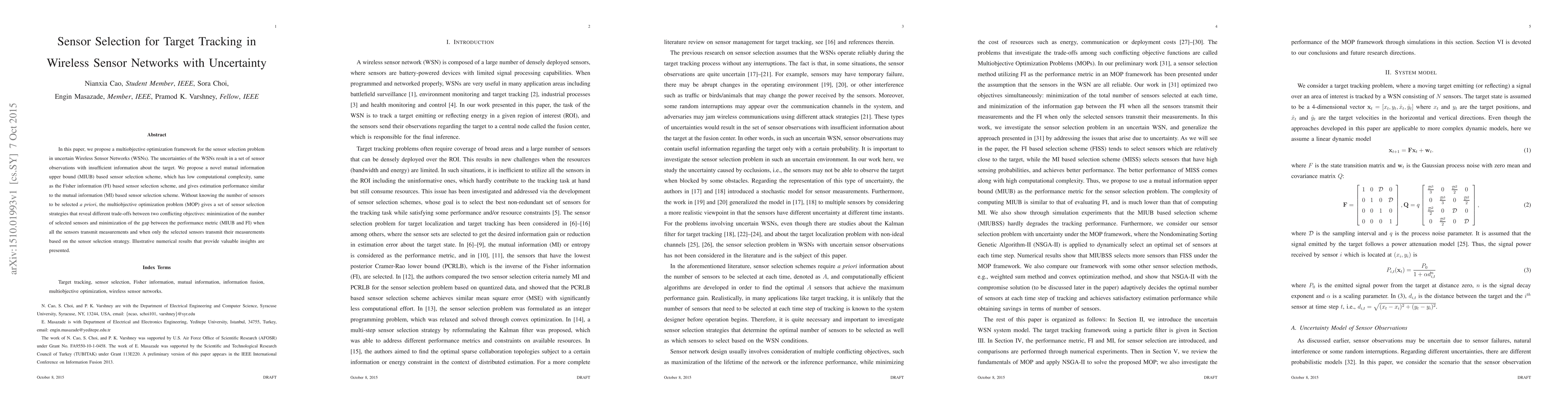 In this paper, we propose a multiobjective optimization framework for the sensor selection problem in uncertain Wireless Sensor Networks (WSNs). The uncertainties of the WSNs result in a set of sensor observations with insufficient information about the target. We propose a novel mutual information upper bound (MIUB) based sensor selection scheme, which has low computational complexity, same as the Fisher information (FI) based sensor selection scheme, and gives estimation performance similar to the mutual information (MI) based sensor selection scheme. Without knowing the number of sensors to be selected a priori, the multiobjective optimization problem (MOP) gives a set of sensor selection strategies that reveal different trade-offs between two conflicting objectives: minimization of the number of selected sensors and minimization of the gap between the performance metric (MIUB and FI) when all the sensors transmit measurements and when only the selected sensors transmit their measurements based on the sensor selection strategy. Illustrative numerical results that provide valuable insights are presented.