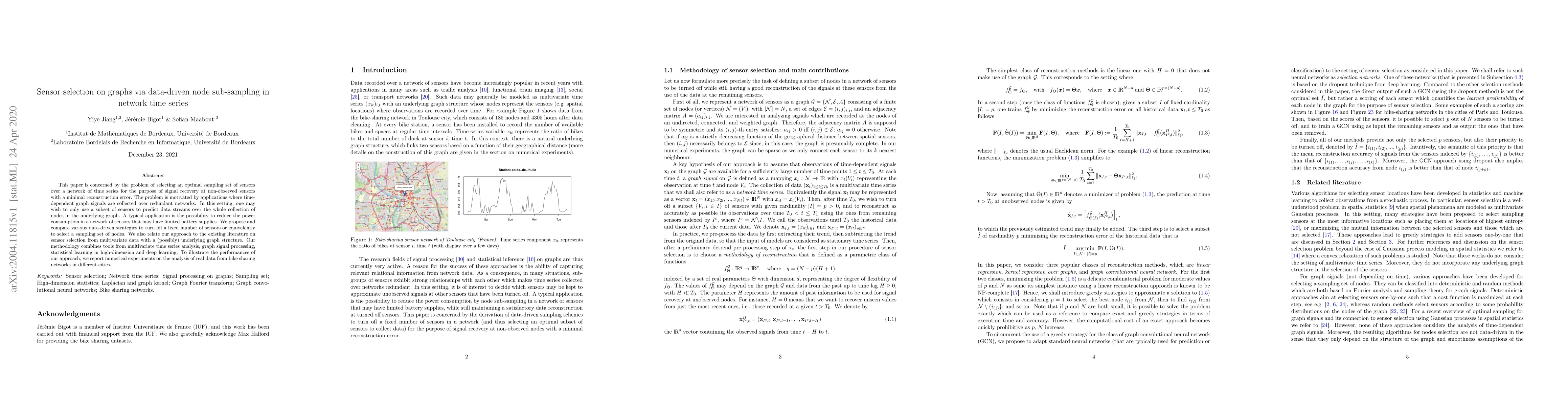This paper proposes data-driven methods for selecting sensors in a network to recover signals with minimal reconstruction error, aiming to reduce power consumption in sensor networks. It combines tools from multivariate time series analysis, graph signal processing, and statistical learning to analyze real-world bike sharing networks.