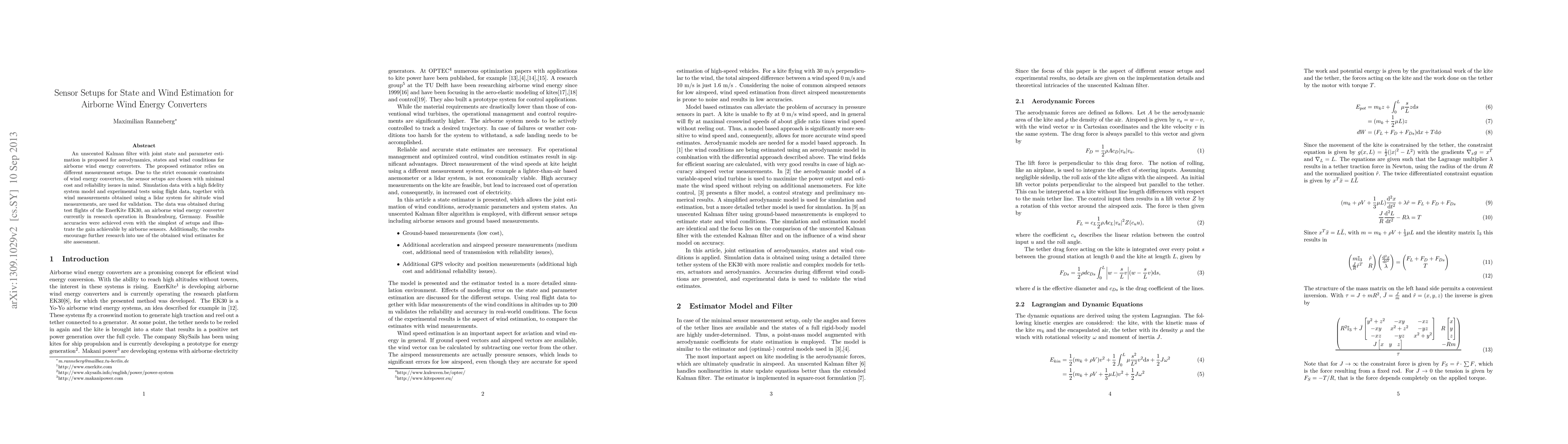 This paper proposes an unscented Kalman filter for estimating states and wind conditions in airborne wind energy converters, focusing on cost-effective sensor setups. Validation through simulations and real flight data from the EnerKité EK30 demonstrates feasible accuracy, encouraging further research into wind site assessment.