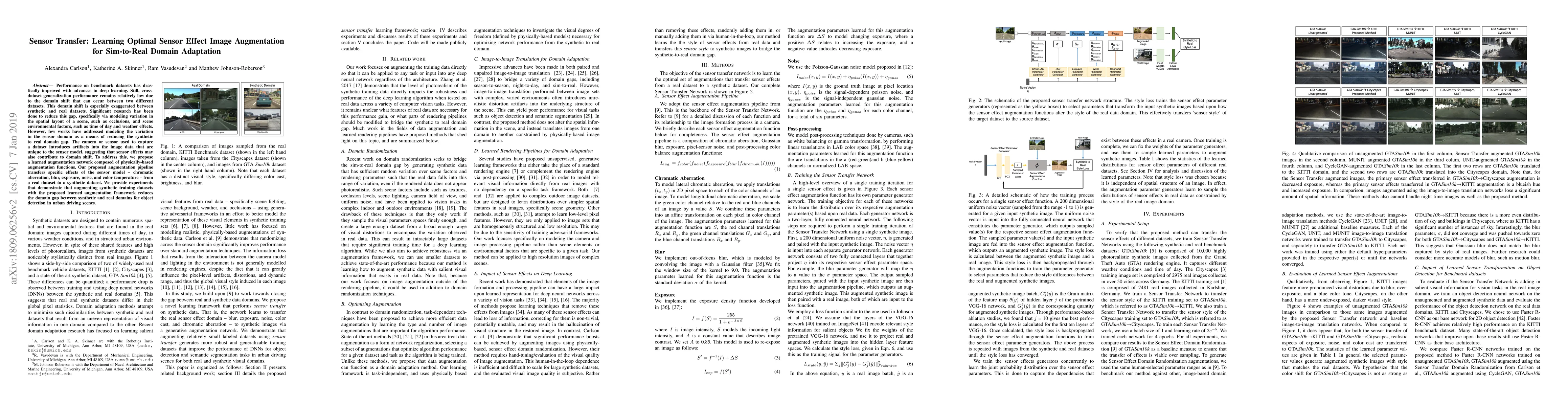 Performance on benchmark datasets has drastically improved with advances in deep learning. Still, cross-dataset generalization performance remains relatively low due to the domain shift that can occur between two different datasets. This domain shift is especially exaggerated between synthetic and real datasets. Significant research has been done to reduce this gap, specifically via modeling variation in the spatial layout of a scene, such as occlusions, and scene environmental factors, such as time of day and weather effects. However, few works have addressed modeling the variation in the sensor domain as a means of reducing the synthetic to real domain gap. The camera or sensor used to capture a dataset introduces artifacts into the image data that are unique to the sensor model, suggesting that sensor effects may also contribute to domain shift. To address this, we propose a learned augmentation network composed of physically-based augmentation functions. Our proposed augmentation pipeline transfers specific effects of the sensor model -- chromatic aberration, blur, exposure, noise, and color temperature -- from a real dataset to a synthetic dataset. We provide experiments that demonstrate that augmenting synthetic training datasets with the proposed learned augmentation framework reduces the domain gap between synthetic and real domains for object detection in urban driving scenes.