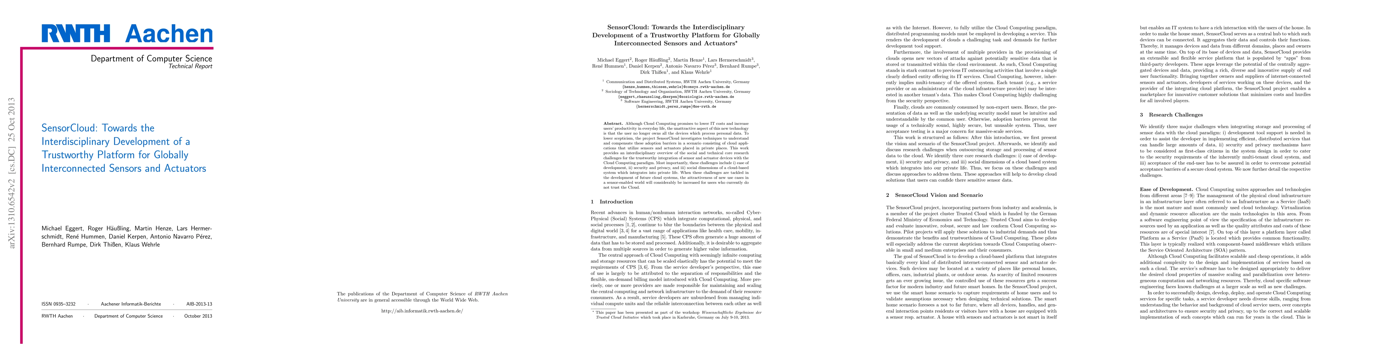 Although Cloud Computing promises to lower IT costs and increase users' productivity in everyday life, the unattractive aspect of this new technology is that the user no longer owns all the devices which process personal data. To lower scepticism, the project SensorCloud investigates techniques to understand and compensate these adoption barriers in a scenario consisting of cloud applications that utilize sensors and actuators placed in private places. This work provides an interdisciplinary overview of the social and technical core research challenges for the trustworthy integration of sensor and actuator devices with the Cloud Computing paradigm. Most importantly, these challenges include i) ease of development, ii) security and privacy, and iii) social dimensions of a cloud-based system which integrates into private life. When these challenges are tackled in the development of future cloud systems, the attractiveness of new use cases in a sensor-enabled world will considerably be increased for users who currently do not trust the Cloud.