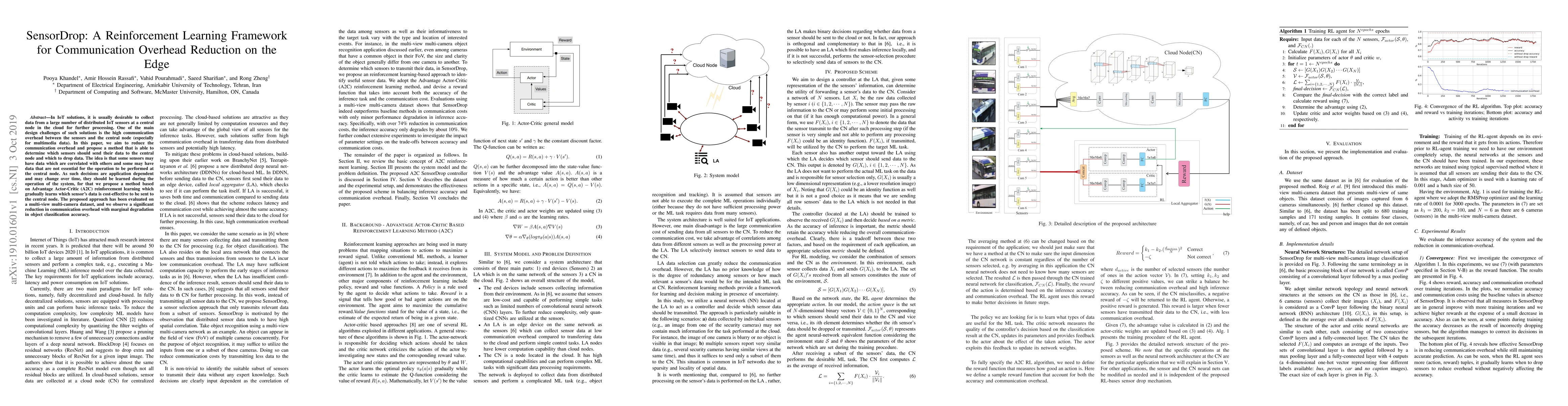 SensorDrop employs a reinforcement learning framework based on Advantage Actor-Critic (A2C) to reduce communication overhead in IoT systems by determining which sensor data should be sent to the central node. The method shows significant reduction in communication costs with minimal impact on object classification accuracy.