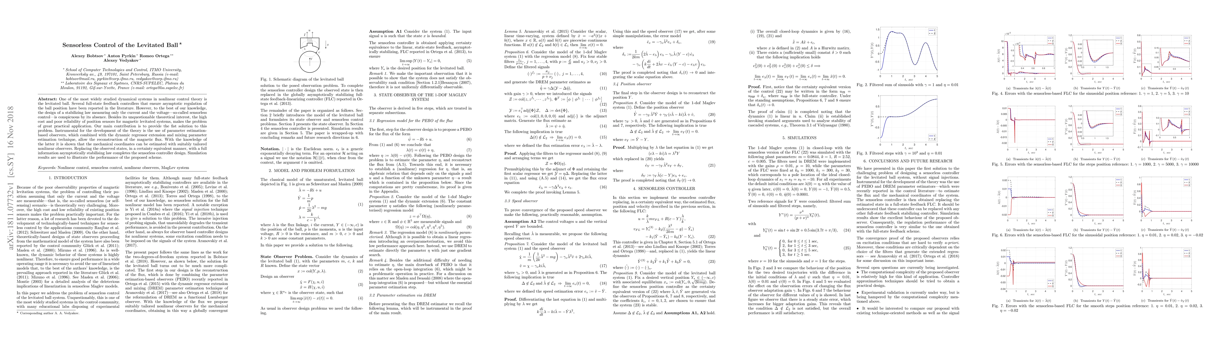 One of the most widely studied dynamical systems in nonlinear control theory is the levitated ball. Several full-state feedback controllers that ensure asymptotic regulation of the ball position have been reported in the literature. However, to the best of our knowledge, the design of a stabilizing law measuring only the current and the voltage - so-called sensorless control - is conspicuous by its absence. Besides its unquestionable theoretical interest, the high cost and poor reliability of position sensors for magnetic levitated systems, makes the problem of great practical application. Our main contribution is to provide the fist solution to this problem. Instrumental for the development of the theory is the use of parameter estimation-based observers, which combined with the dynamic regressor extension and mixing parameter estimation technique, allow the reconstruction of the magnetic flux. With the knowledge of the latter it is shown that the mechanical coordinates can be estimated with suitably tailored nonlinear observers. Replacing the observed states, in a certainty equivalent manner, with a full information asymptotically stabilising law completes the sensorless controller design. Simulation results are used to illustrate the performance of the proposed scheme.
