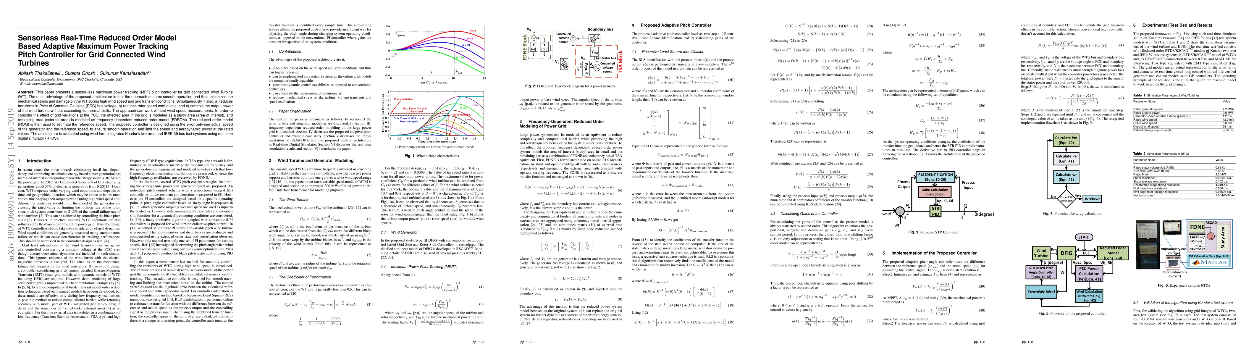 This paper presents a sensor-less maximum power tracking (MPT) pitch controller for grid connected Wind Turbine (WT). The main advantage of the proposed architecture is that the approach ensures smooth operation and thus minimizes the mechanical stress and damage on the WT during high wind speed and grid transient conditions. Simultaneously, it also: a) reduces transients in Point of Common Coupling (PCC) bus voltage, b) reduces rotor speed oscillations, and c) controls the output power of the wind turbine without exceeding its thermal limits. The approach can work without wind speed measurements. In order to consider the effect of grid variations at the PCC, the affected area in the grid is modeled as a study area (area of interest), and remaining area (external area) is modeled as frequency dependent reduced order model (FDROM). The reduced order model (ROM) is then used to estimate the reference speed. The proposed controller is designed using the error between actual speed of the generator and the reference speed, to ensure smooth operation and limit the speed and aerodynamic power at the rated values. The architecture is evaluated using wind farm integrated Kundur's two-area and IEEE-39 bus test systems using real-time digital simulator (RTDS).
