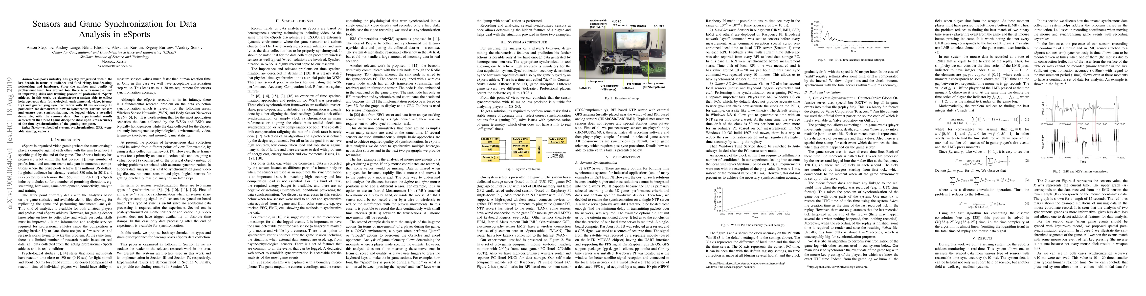 eSports industry has greatly progressed within the last decade in terms of audience and fund rising, broadcasting, networking and hardware. Since the number and quality of professional team has evolved too, there is a reasonable need in improving skills and training process of professional eSports athletes. In this work, we demonstrate a system able to collect heterogeneous data (physiological, environmental, video, telemetry) and guarantying synchronization with 10 ms accuracy. In particular, we demonstrate how to synchronize various sensors and ensure post synchronization, i.e. logged video, a so-called demo file, with the sensors data. Our experimental results achieved on the CS:GO game discipline show up to 3 ms accuracy of the time synchronization of the gaming computer.