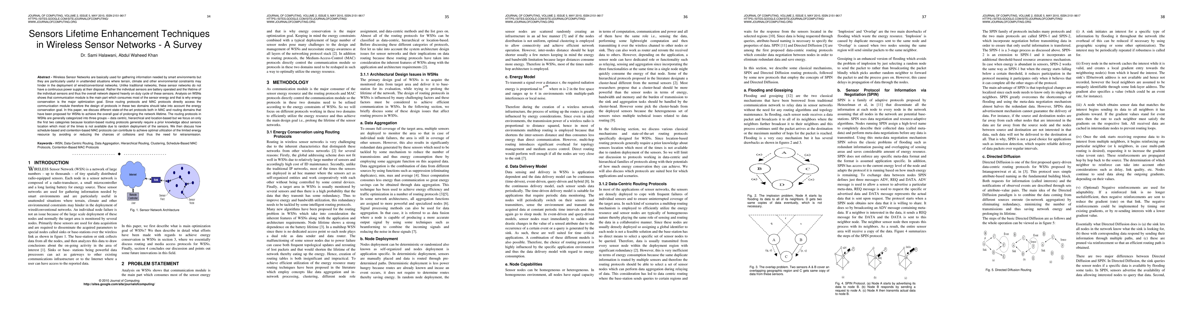 This paper surveys techniques to enhance the lifetime of sensors in Wireless Sensor Networks (WSNs), focusing on energy-efficient routing and MAC protocols. It discusses state-of-the-art protocols in data-centric and hierarchical routing, and how schedule-based and contention-based MAC protocols optimize energy use by minimizing collisions and reducing retransmissions.