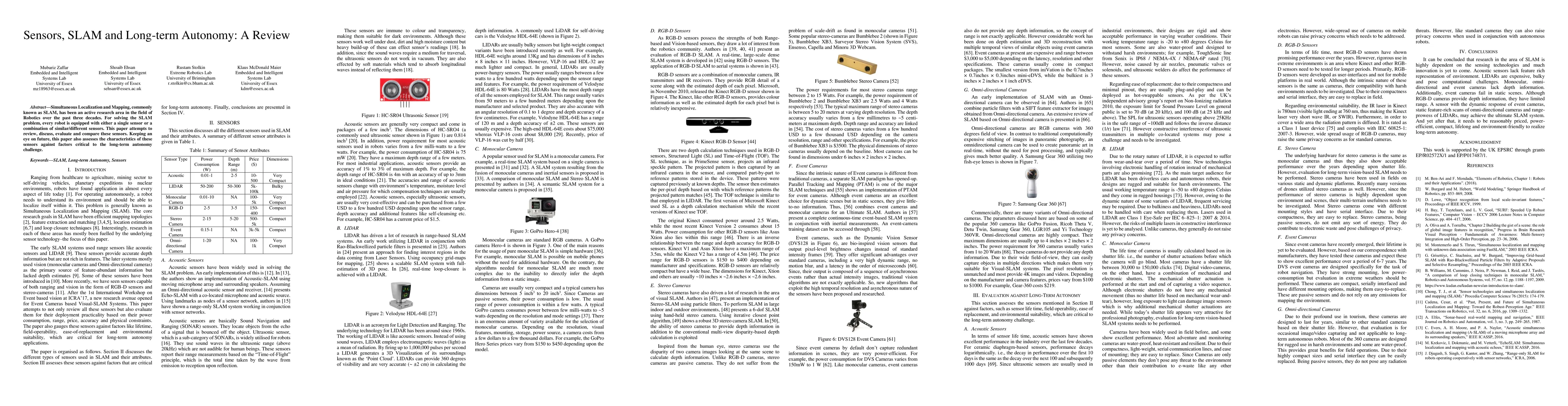 This paper reviews various sensors used in Simultaneous Localization and Mapping (SLAM) for robotics, evaluating their effectiveness and comparing their suitability for long-term autonomy challenges. It assesses sensor characteristics in relation to future advancements in autonomous robotic systems.