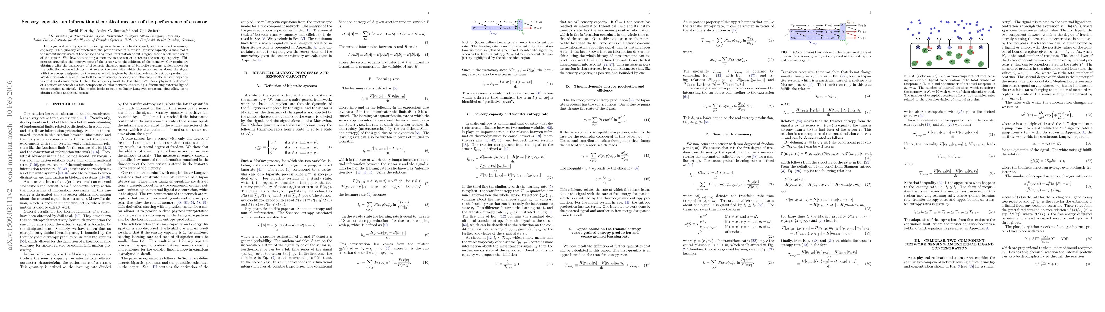 For a general sensory system following an external stochastic signal, we introduce the sensory capacity. This quantity characterizes the performance of a sensor: sensory capacity is maximal if the instantaneous state of the sensor has as much information about a signal as the whole time-series of the sensor. We show that adding a memory to the sensor increases the sensory capacity. This increase quantifies the improvement of the sensor with the addition of the memory. Our results are obtained with the framework of stochastic thermodynamics of bipartite systems, which allows for the definition of an efficiency that relates the rate with which the sensor learns about the signal with the energy dissipated by the sensor, which is given by the thermodynamic entropy production. We demonstrate a general tradeoff between sensory capacity and efficiency: if the sensory capacity is equal to its maximum 1, then the efficiency must be less than 1/2. As a physical realization of a sensor we consider a two component cellular network estimating a fluctuating external ligand concentration as signal. This model leads to coupled linear Langevin equations that allow us to obtain explicit analytical results.