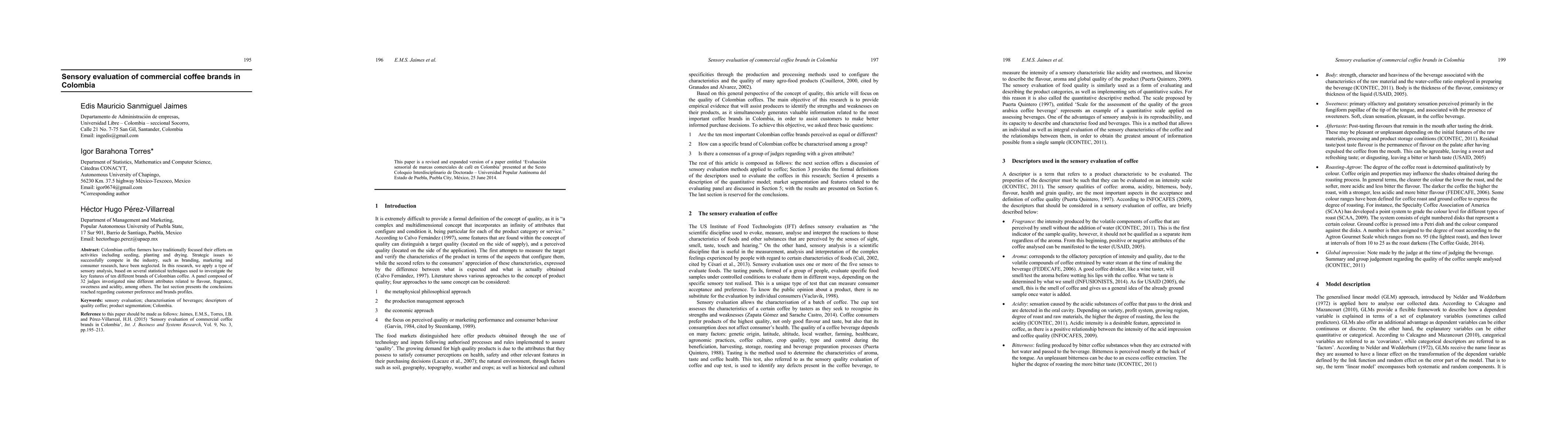Colombian coffee farmers have traditionally focused their efforts on activities including seeding, planting and drying. Strategic issues to successfully compete in the industry, such as branding, marketing and consumer research, have been neglected. In this research, we apply a type of sensory analysis, based on several statistical techniques used to investigate the key features of ten different brands of Colombian coffee. A panel composed of 32 judges investigated nine different attributes related to flavour, fragrance, sweetness and acidity, among others. The last section presents the conclusions reached regarding customer preference and brands profiles.