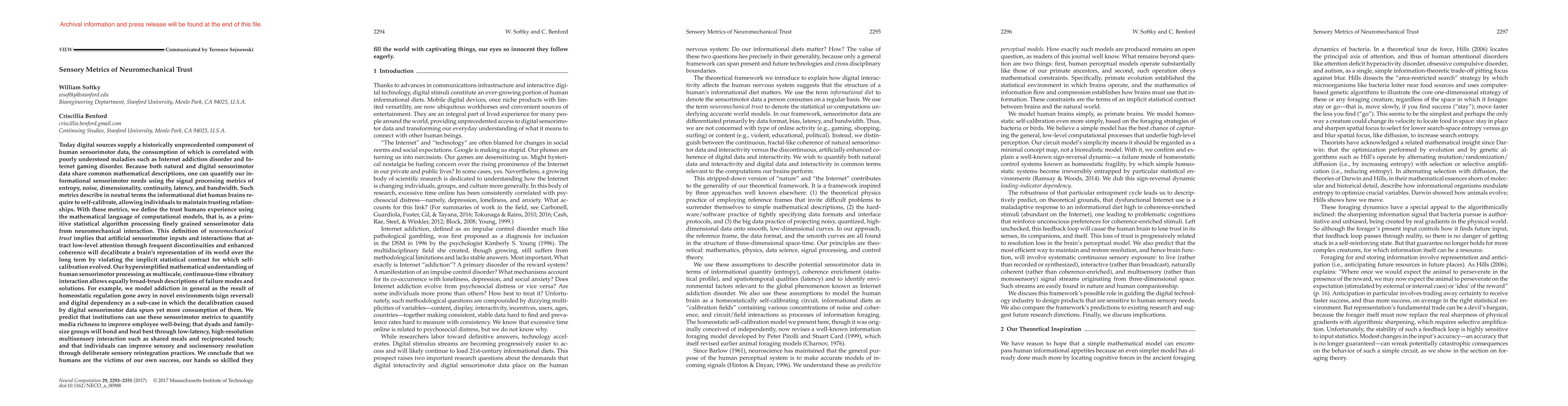 Today digital sources supply an unprecedented component of human sensorimotor data, the consumption of which is correlated with poorly understood maladies such as Internet Addiction Disorder and Internet Gaming Disorder. This paper offers a mathematical understanding of human sensorimotor processing as multiscale, continuous-time vibratory interaction. We quantify human informational needs using the signal processing metrics of entropy, noise, dimensionality, continuity, latency, and bandwidth. Using these metrics, we define the trust humans experience as a primitive statistical algorithm processing finely grained sensorimotor data from neuromechanical interaction. This definition of neuromechanical trust implies that artificial sensorimotor inputs and interactions that attract low-level attention through frequent discontinuities and enhanced coherence will decalibrate a brain's representation of its world over the long term by violating the implicit statistical contract for which self-calibration evolved. This approach allows us to model addiction in general as the result of homeostatic regulation gone awry in novel environments and digital dependency as a sub-case in which the decalibration caused by digital sensorimotor data spurs yet more consumption of them. We predict that institutions can use these sensorimotor metrics to quantify media richness to improve employee well-being; that dyads and family-size groups will bond and heal best through low-latency, high-resolution multisensory interaction such as shared meals and reciprocated touch; and that individuals can improve sensory and sociosensory resolution through deliberate sensory reintegration practices. We conclude that we humans are the victims of our own success, our hands so skilled they fill the world with captivating things, our eyes so innocent they follow eagerly.