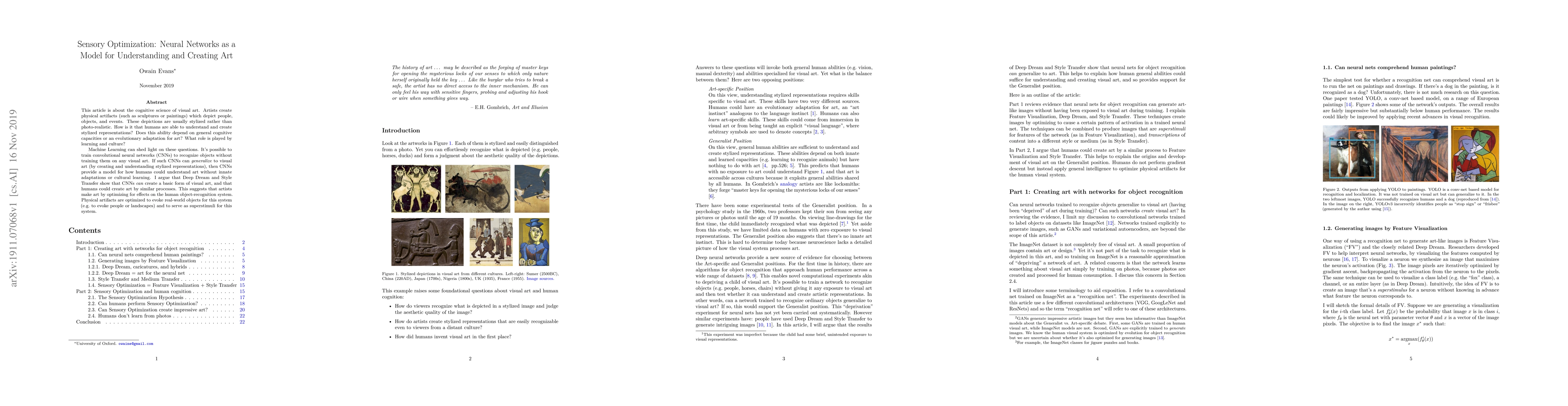 This paper explores the cognitive science behind visual art creation and understanding, suggesting that convolutional neural networks (CNNs) can model human ability to create and interpret stylized representations without innate adaptations. The study posits that artists optimize their work to evoke real-world objects in the human visual system, implying that art creation is a process of sensory optimization.
