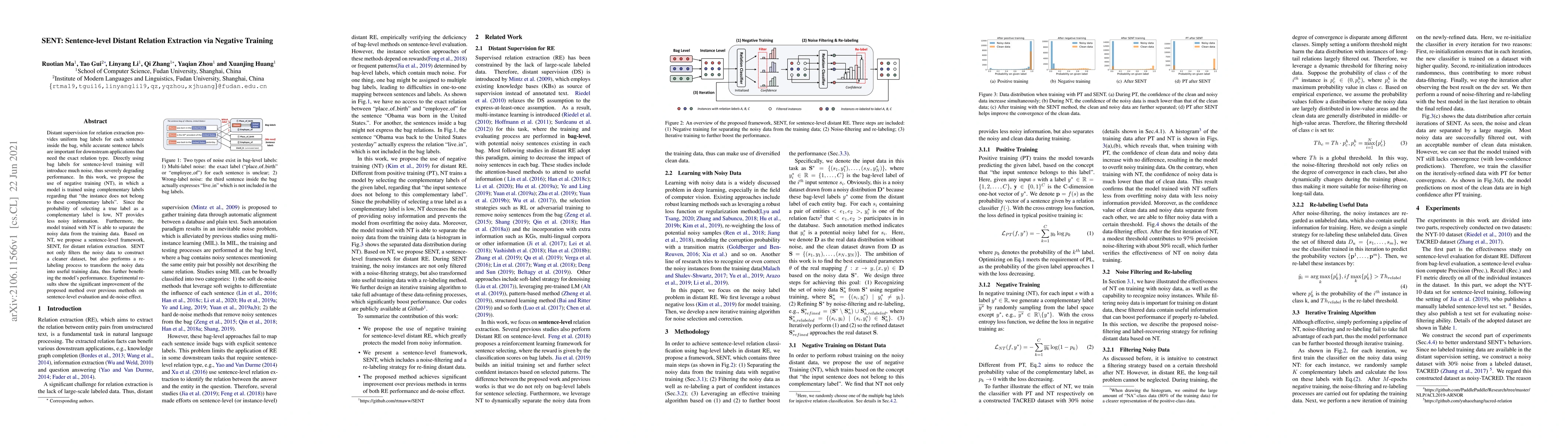 The paper introduces SENT, a framework for sentence-level distant relation extraction that employs negative training (NT) to filter noisy data and transform it into useful training data, resulting in significant performance improvements over previous methods.