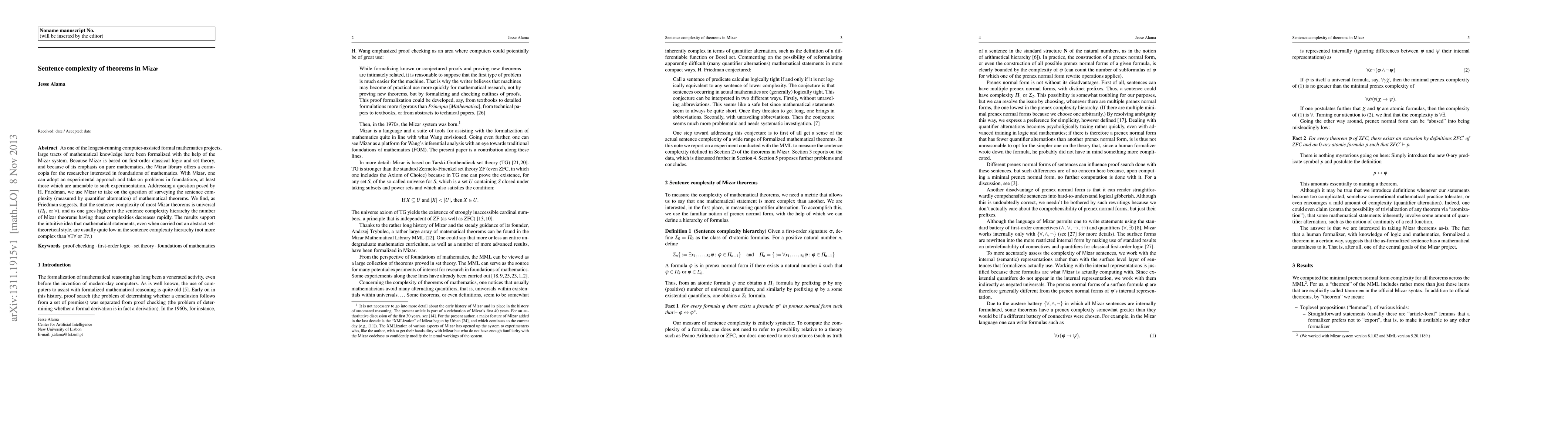 As one of the longest-running computer-assisted formal mathematics projects, large tracts of mathematical knowledge have been formalized with the help of the Mizar system. Because Mizar is based on first-order classical logic and set theory, and because of its emphasis on pure mathematics, the Mizar library offers a cornucopia for the researcher interested in foundations of mathematics. With Mizar, one can adopt an experimental approach and take on problems in foundations, at least those which are amenable to such experimentation. Addressing a question posed by H. Friedman, we use Mizar to take on the question of surveying the sentence complexity (measured by quantifier alternation) of mathematical theorems. We find, as Friedman suggests, that the sentence complexity of most Mizar theorems is universal ($\Pi_{1}$, or $\forall$), and as one goes higher in the sentence complexity hierarchy the number of Mizar theorems having these complexities decreases rapidly. The results support the intuitive idea that mathematical statements, even when carried out an abstract set-theoretical style, are usually quite low in the sentence complexity hierarchy (not more complex than $\forall\exists\forall$ or $\exists\forall$).