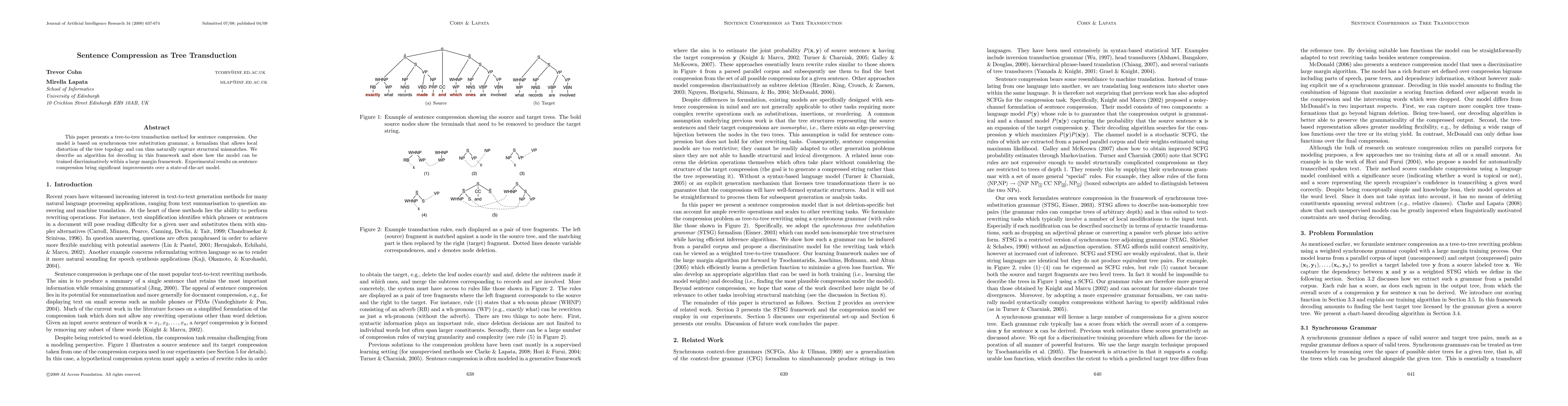 This paper introduces a tree-to-tree transduction method for sentence compression using synchronous tree substitution grammar, achieving significant improvements over existing models through discriminative training within a large margin framework. Experimental results demonstrate its effectiveness in compressing sentences while maintaining structural integrity.