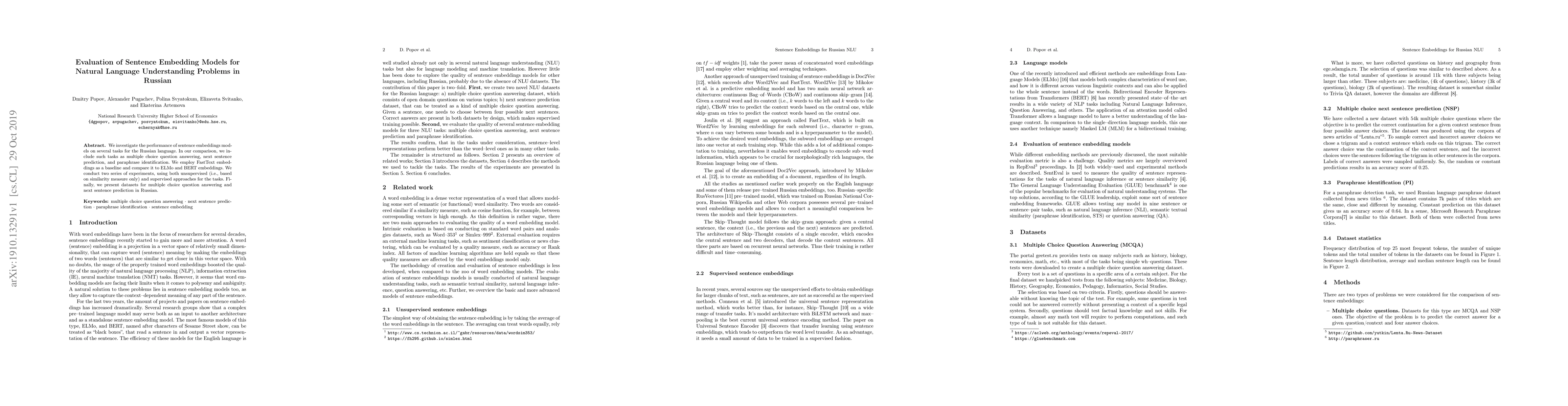 This paper compares the performance of FastText, ELMo, and BERT sentence embeddings for Russian natural language understanding tasks, including multiple choice question answering, next sentence prediction, and paraphrase identification, using both unsupervised and supervised methods. It also introduces new datasets for these tasks.
