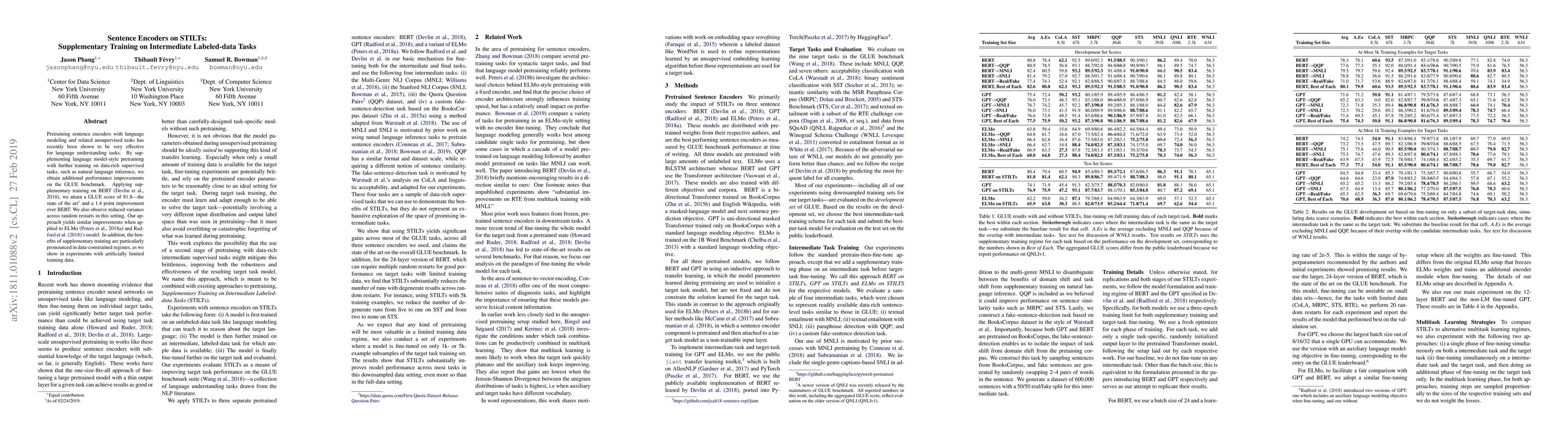 Pretraining sentence encoders with language modeling and related unsupervised tasks has recently been shown to be very effective for language understanding tasks. By supplementing language model-style pretraining with further training on data-rich supervised tasks, such as natural language inference, we obtain additional performance improvements on the GLUE benchmark. Applying supplementary training on BERT (Devlin et al., 2018), we attain a GLUE score of 81.8---the state of the art (as of 02/24/2019) and a 1.4 point improvement over BERT. We also observe reduced variance across random restarts in this setting. Our approach yields similar improvements when applied to ELMo (Peters et al., 2018a) and Radford et al. (2018)'s model. In addition, the benefits of supplementary training are particularly pronounced in data-constrained regimes, as we show in experiments with artificially limited training data.