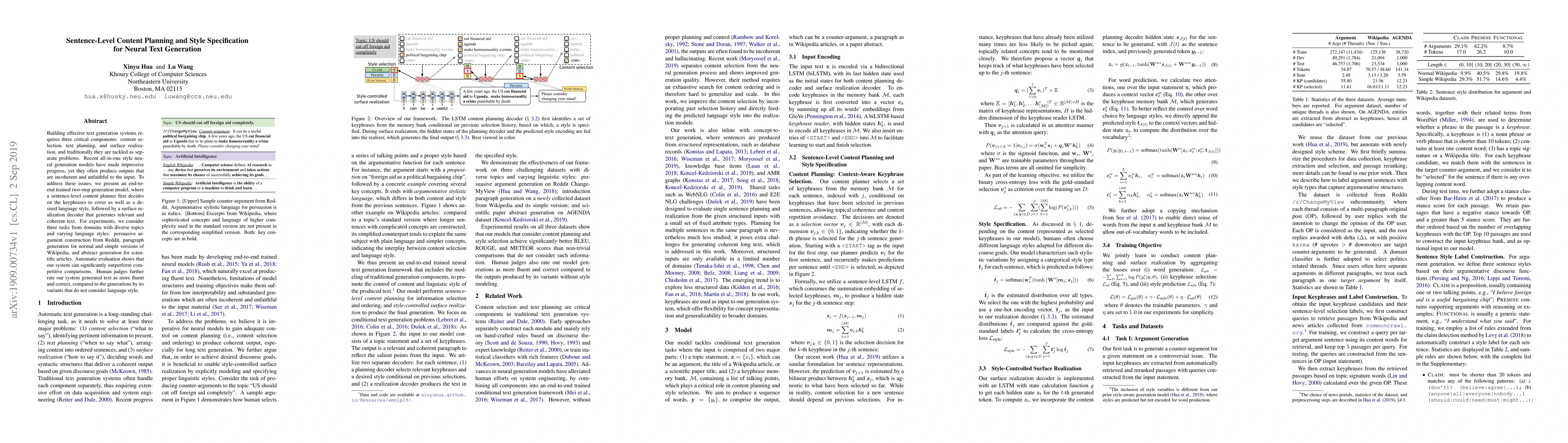 This paper proposes a two-step neural text generation model that first plans sentence-level content and specifies language style, followed by a decoder for coherent text generation. The model outperforms competitors in automatic evaluation and is rated higher for fluency and correctness by human judges across diverse text generation tasks.