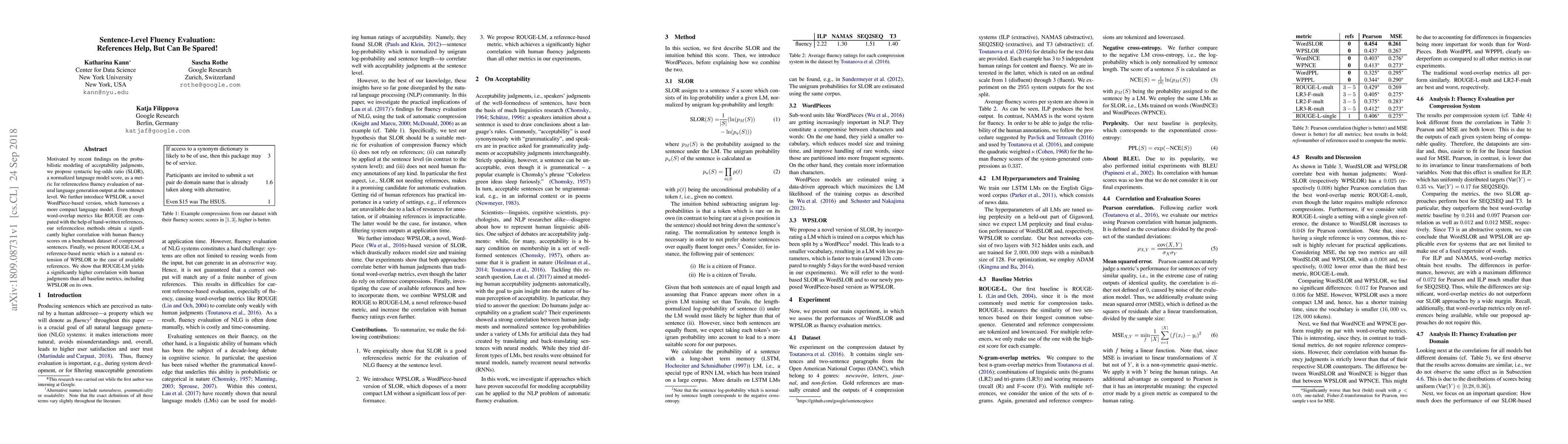This paper proposes SLOR and its WordPiece-based version WPSLOR for referenceless fluency evaluation of natural language generation, demonstrating higher correlation with human judgments than reference-based metrics like ROUGE. It also introduces ROUGE-LM, a reference-based extension of WPSLOR, which shows superior performance compared to all baseline metrics.
