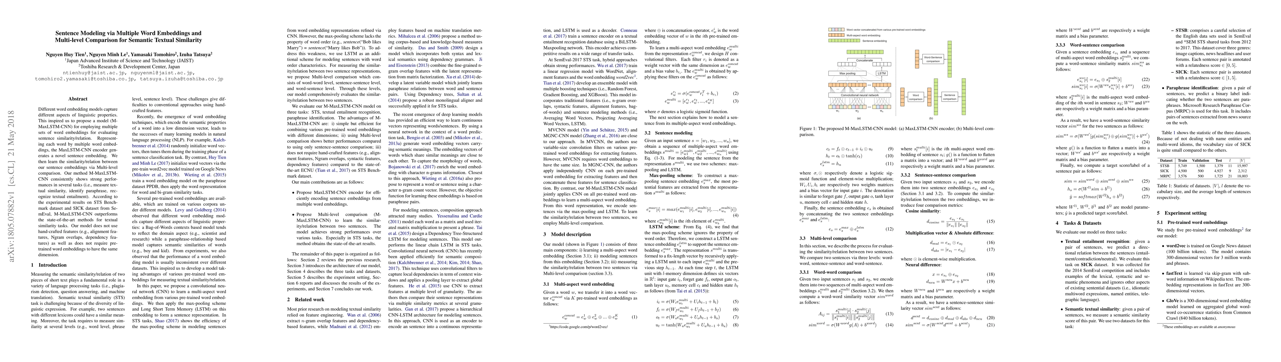 This paper proposes M-MaxLSTM-CNN, a model that uses multiple word embeddings to generate novel sentence embeddings via a MaxLSTM-CNN encoder and evaluates sentence similarity via multi-level comparison. The method outperforms state-of-the-art models on textual similarity tasks without using hand-crafted features or requiring uniform embedding dimensions.