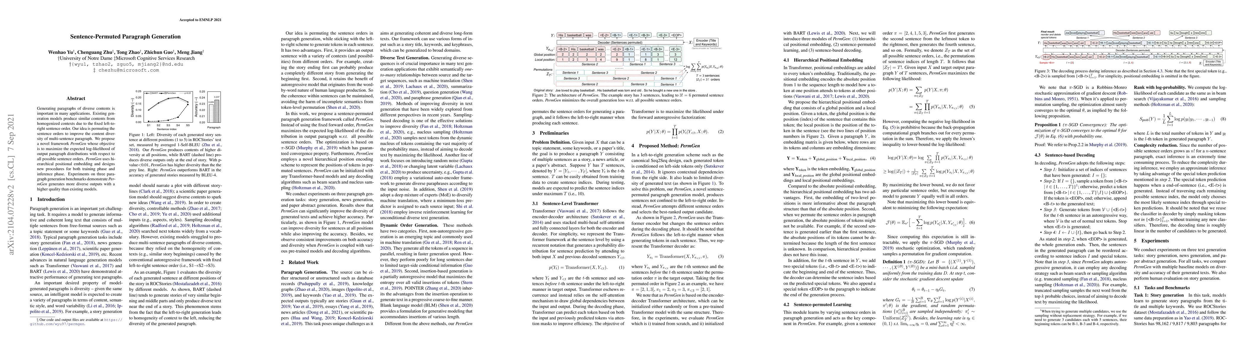 This paper proposes a novel framework called PermGen to generate diverse multi-sentence paragraphs by permuting sentence orders, using hierarchical positional embedding and new training procedures. Experiments show PermGen produces more diverse and higher quality outputs compared to existing models.